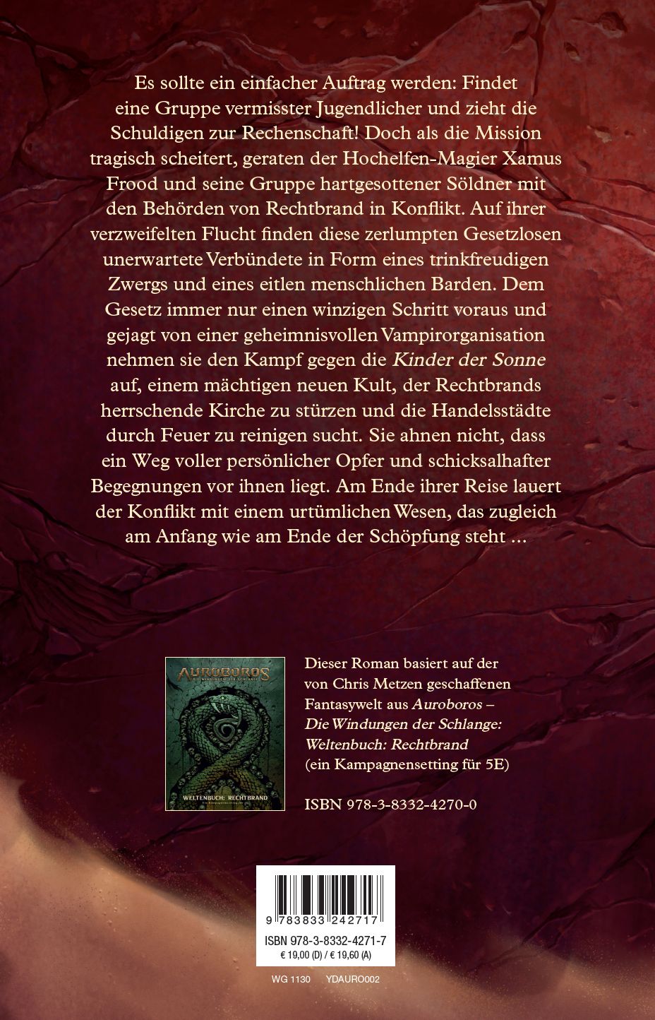 Es sollte ein einfacher Auftrag werden: Findet eine Gruppe vermisster Jugendlicher und zieht die Schuldigen zur Rechenschaft! Doch als die Mission tragisch scheitert, geraten der Hochelfen-Magier Xamus Frood und seine Gruppe hartgesottener Söldner mit den Behörden von Rechtbrand in Konflikt. Auf ihrer verzweifelten Flucht finden diese zerlumpten Gesetzlosen unerwartete Verbündete in Form eines trinkfreudigen Zwergs und eines eitlen menschlichen Barden. Dem Gesetz immer nur einen winzigen Schritt voraus und gejagt von einer geheimnisvollen Vampirorganisation nehmen sie den Kampf gegen die Kinder der Sonne auf, einem mächtigen neuen Kult, der Rechtbrands herrschende Kirche zu stürzen und die Handelsstädte durch Feuer zu reinigen sucht. Sie ahnen nicht, dass ein Weg voller persönlicher Opfer und schicksalhafter Begegnungen vor ihnen liegt. Am Ende ihrer Reise lauert der Konflikt mit einem urtümlichen Wesen, das zugleich am Anfang wie am Ende der Schöpfung steht ... Dieser Roman basiert auf der von Chris Metzen geschaffenen Fantasywelt aus Auroboros - Die Windungen der Schlange: Weltenbuch: Rechtbrand (ein Kampagnensetting für 5E). Der Titel mit der ISBN 978-3-8332-4270-0 ist ebenfalls bei Panini erschienen.
