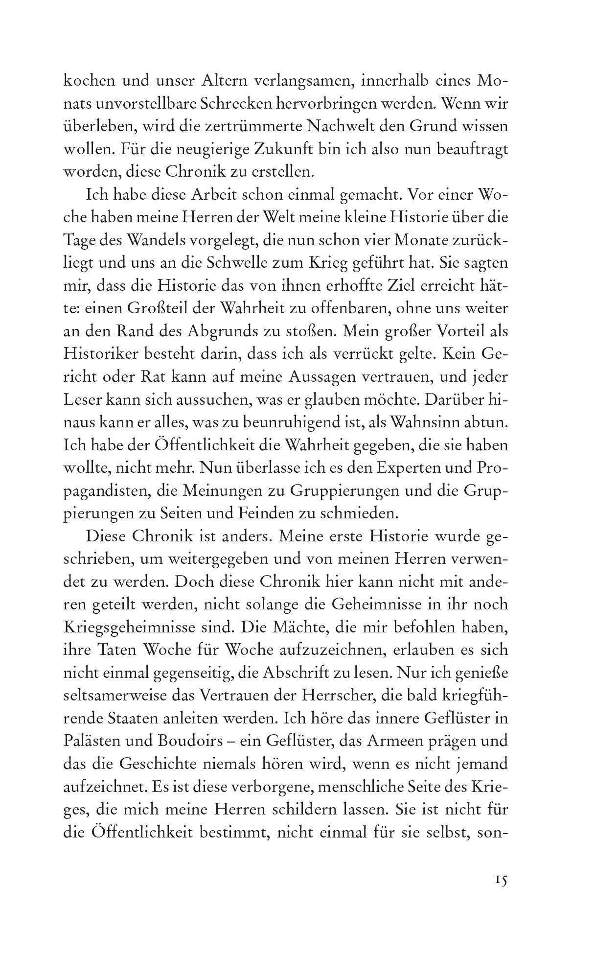 Verfasst am 6. Juli 2454 In Alexandria Es ist Hybris, Leser, sich selbst als der Aller-Irgendwas in der Geschichte zu bezeichnen: der Mächtigste, der am meisten Misshandelte, der Einsamste. Die Erfahrung und das griechische Blut in meinen Adern lehren mich, Hybris mehr als alle Sünden zu fürchten. Und doch kann ich nicht umhin, mich, wenn ich mich hier erneut vorstellen darf, als den unverdientermaßen gesegnetsten Menschen zu bezeichnen, der je gelebt hat. Ich, der sich einst Tat für Tat durch den Sündenkatalog arbeitete. Ich, Kannibale, Folterknecht, Verräter und Vatermörder, der sich mit siebzehn der verdienten Hinrichtung hingab. Ich, Mycroft Canner, bin mit einunddreißig Jahren lebendiger, gesünder und viel freier, als ich verdiene. Ich nutze meine Fähigkeiten in den Diensten nicht nur eines, sondern mehrerer würdiger Herren und darf sogar nachts in den Armen desjenigen schlafen, dessen Umarmung stets der einzige Ort in diesem Universum sein wird, an dem ich mich geborgen fühle, während auch er sein Zuhause gefunden hat: auf dem Boden vor dem Schlafgemach seiner Herrin. Der Krieg ist zwar noch nicht ausgebrochen, aber das Wasser hat sich bereits zurückgezogen, um die Flutwelle zu bilden, und die Strände mit all ihren Geheimnissen liegen blank. Hobbes sagt uns, dass der Krieg nicht nur aus der Schlacht bestehe, sondern aus jenem Zeitabschnitt, in dem der Wille zum Kampf so offensichtlich ist, dass derjenige, der den Blutrausch bei seinen Mitmenschen und in sich selbst wittert, dem Versprechen der Zivilisation, Frieden zu wahren, nicht mehr trauen kann. Wenn dem so ist, befinden wir uns im Krieg.
