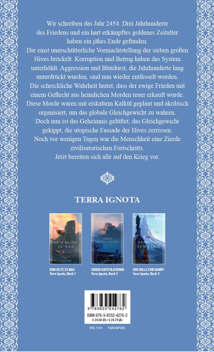 Wir schreiben das Jahr 2454. Drei Jahrhunderte des Friedens und ein hart erkämpftes goldenes Zeitalter haben ein jähes Ende gefunden. Die einst unerschütterliche Vormachtstellung der sieben großen Hives bröckelt. Korruption und Betrug haben das System unterhöhlt. Aggression und Blutdurst, die Jahrhunderte lang unterdrückt wurden, sind nun wieder entfesselt worden. Die schreckliche Wahrheit lautet, dass der ewige Frieden mit einem Geflecht aus heimlichen Morden teuer erkauft wurde. Diese Morde waren mit eiskaltem Kalkül geplant und akribisch organisiert, um das globale Gleichgewicht zu wahren. Doch nun ist das Geheimnis gelüftet, das Gleichgewicht gekippt, die utopische Fassade der Hives zerrissen. Noch vor wenigen Tagen war die Menschheit eine Zierde zivilisatorischen Fortschritts. Jetzt bereiten sich alle auf den Krieg vor.Band 3 der Reihe Terra IgnotaÜberblick über die Reihe Terra IgnotaBand 1: Dem Blitz zu nahBand 2: Sieben KapitulationenBand 3: Der Wille zum Kampf