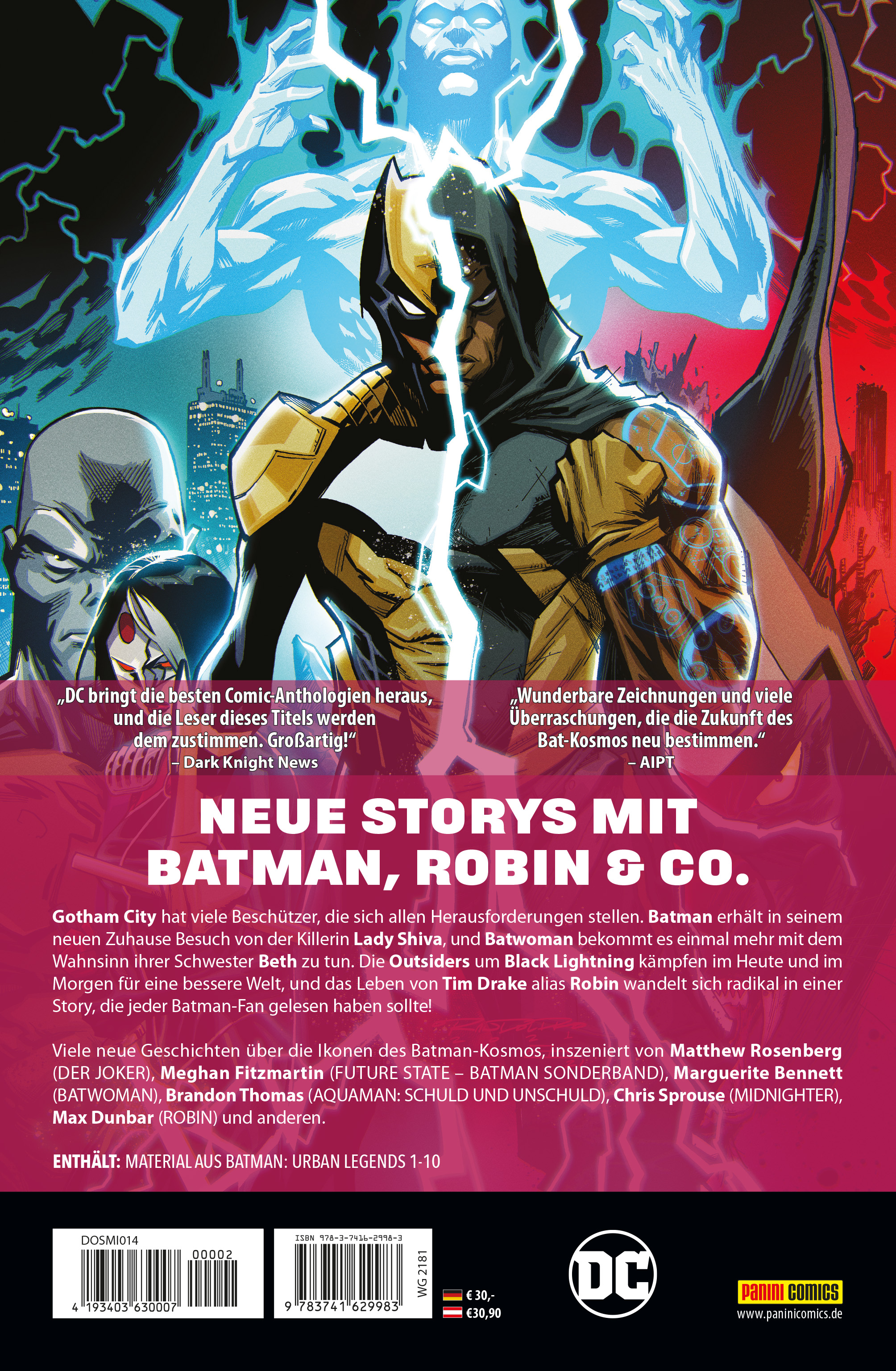 GOTHAM HEUTE UND MORGEN von Christian Endres Die Geschichten in diesem Band widmen sich den verschiedensten Helden und Antihelden mit Bezug zu Batman oder Gotham City - und sind allesamt deutschsprachige Erstveröffentlichungen. Die meisten können weitgehend ohne Vorwissen für sich gelesen werden. Allerdings setzt zum Beispiel die Story über Kate Kane alias Batwoman und ihre einst kriminell-verrückte Schwester Beth während des Events Fear State - Stadt der Angst ein: Furcht und Chaos regieren in Gotham, und die aus den Peacekeeper-Hightech-Polizisten bestehende Magistrat-Armee des skrupellosen Industriellen Simon Saint will die Kontrolle übernehmen. Vor einer Weile kamen außerdem Black Lightning, Katana und Signal als neues Outsiders-Team des Dunklen Ritters zusammen, wobei es sich bei Signal um den jungen Duke Thomas handelt, der erstaunliche Lichtkräfte geerbt hat. Und während Barbara Gordon aktuell sowohl als Batgirl wie auch als Computer-Genie Oracle über Gotham wacht und sich schon mit der bösen Hackerin Vi Ross angelegt hat, leitet sie überdies Stephanie Brown und Cassandra Cain als Batgirls der nächsten Generation an. Die Story über Cass' Mutter, die Auftragskillerin Lady Shiva, thematisiert derweil Batmans Umzug in die City von Gotham, wo er im Viertel Fort Graye eine Wohnung und neue Mikro-Bat-Höhlen hat. Die außerirdische Kriegerin Zealot stammt indes aus dem vor Aliens und Geheimoperationen nur so strotzenden Universum der Wildcats. Mehrere Panel-Erzählungen werfen zudem einen Blick in die Zukunft - inspiriert vom Event Future State von 2020, in dem Gotham zum Polizeistaat wurde, und vom Event DC One Million, das sich 1998 dem Heldenkosmos im fernen 853. Jahrhundert widmete. Und dann ist da noch eine Story über Tim Drake, die weltweit für Schlagzeilen sorgte. Der brillante dritte Robin nach Dick Grayson und Jason Todd war lange mit Stephanie Brown (früher Spoiler) liiert und nannte sich eine ganze Weile Red Robin. In diesem Band mit Storys aus der Reihe BATMAN: URBAN LEGENDS findet Tim nun eine neue Liebe ...