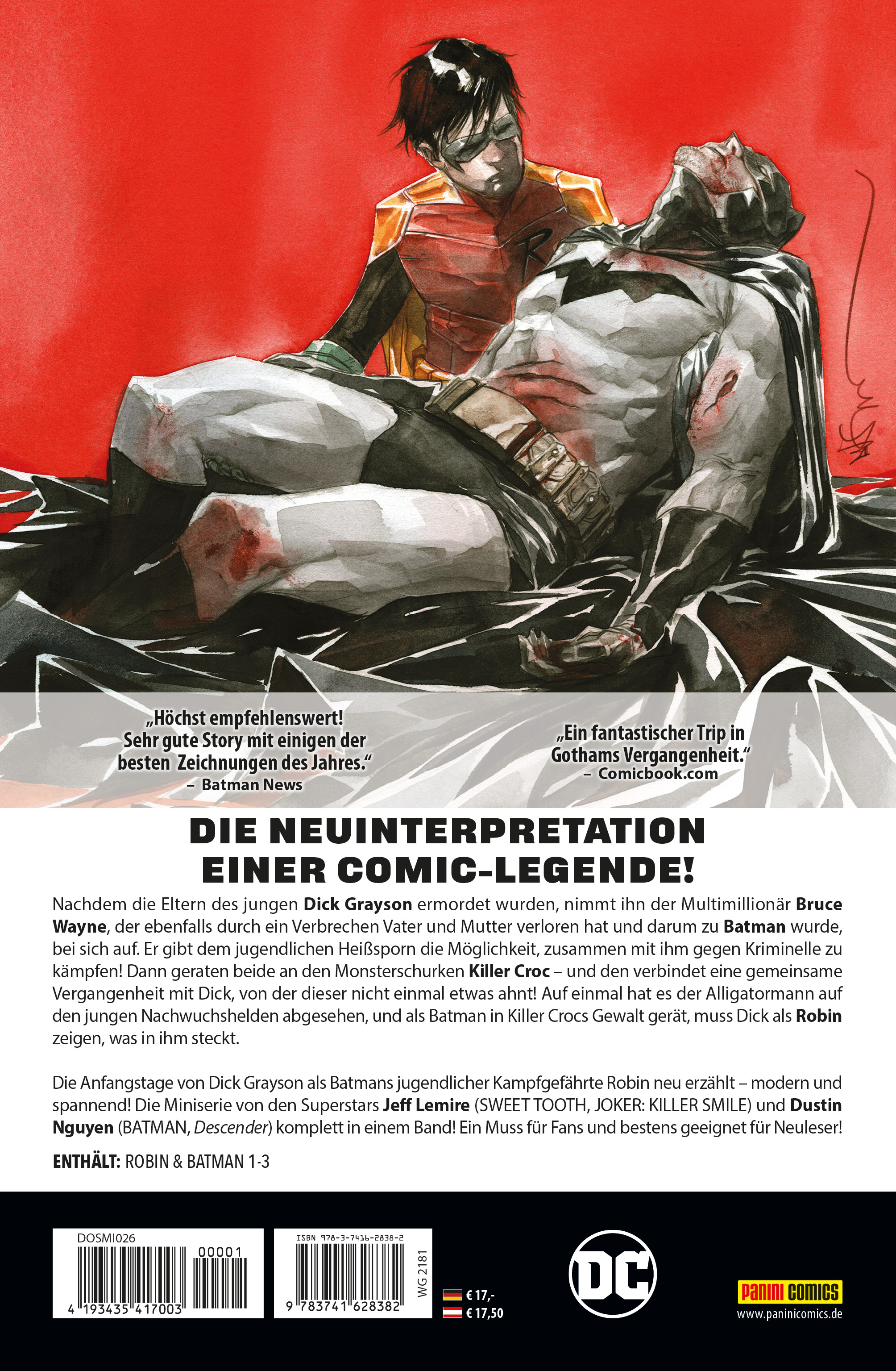 DIE NEUINERPRETATION EINER COMIC-LEGENDE!Nachdem die Eltern des jungen Dick Grayson ermordet wurden, nimmt ihn der Multimillionär Bruce Wayne, der ebenfalls durch ein Verbrechen Vater und Mutter verloren hat und darum zu Batman wurde, bei sich auf. Er gibt dem jugendlichen Heißsporn die Möglichkeit, zusammen mit ihm gegen Kriminelle zu kämpfen! Dann geraten die beiden an den Monsterschurken Killer Croc - und den verbindet eine gemeinsame Vergangenheit mit Dick, von der dieser nicht einmal etwas ahnt! Auf einmal hat es der Alligatorenmann auf en jungen Nachwuchshelden abgesehen, und als Batman in Killer Crocs Gewalt gerät, muss Dick als Robin zeigen, was in ihm steckt.Die Anfangstage von Dick Grayson als Batmans jugendlicher Kampfgefährt Robin neu erzählt - modern und spannend! Die Miniserie von den Superstars Jeff Lemire (SWEET TOOTH, JOKER: KILLER SMILE) und Dustin Nguyen (BATMAN, Descender) komplett in einem Band! Ein Muss für Fans und bestens geeignet für Neuleser!Enthält: Robin & Batman 1-3
