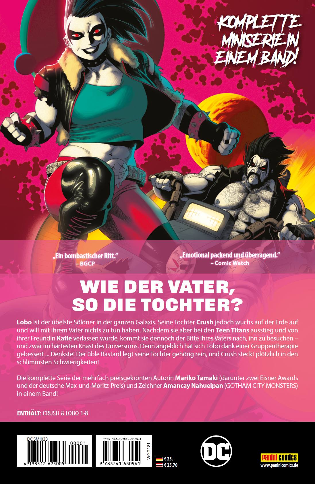 WIE DER VATER, SO DIE TOCHTER?Lobo ist der übelste Söldner in der ganzen Galaxis. Seine Tochter Crush jedoch wuchs auf der Erde auf und will mit ihrem Vater nichts zu tun haben. Nachdem sie aber bei den Teen Titans ausstieg und von ihrer Freundin Katie verlassen wurde, kommt sie dennoch der Bitte ihres Vaters nach, ihn zu besuchen - und zwar im härtesten Knast des Universums. Denn angeblich hat sich Lobo dank einer Gruppentherapie gebessert ... Denkste! Der üble Bastard legt seine Tochter gehörig rein, und Crush steckt plötzlich in den schlimmsten Schwierigkeiten!Die komplette Serie der mehrfach preisgekrönten Autorin Mariko Tamaki (darunter zwei Eisner Awards und der deutsche Max-und-Moritz-Preis) und Zeichner Amancay Nahuelpan (GOTHAM CITY MONSTERS) in einem Band!ENTHÄLT: CRUSH & LOBO 1-8Komplette Miniserie in einem Band