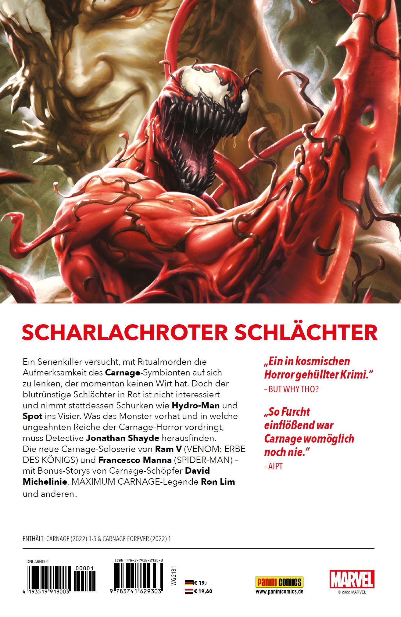 VOROWRT von Christian Endres Mit diesem Band starten wir die neue krasse Soloserie von Carnage – und feiern 30 Jahre scharlachroten Marvel-Wahnsinn! Mitte der 1980er brachte Spider-Man ein „Alien-Kostüm“ aus dem All mit auf die Erde, das sich am Ende jedoch als lebendiger Organismus entpuppte. Spidey trennte sich gewaltsam von dem aggressiven, parasitären Symbionten, woraufhin sich das Alien mit Eddie Brock zu Venom verband. Als Brock 1991 einmal hinter Gittern saß, debütierte in Amazing Spider-Man 344 von Autor David Michelinie und Zeichner Erik Larsen der Serienkiller Cletus Kasady als sein Zellennachbar. Zwischen 1991 und 1992, in Amazing Spider-Man 345, 359 & 361 von Michelinie, Mark Bagley und Chris Marrinan, ging der Sadist eine Symbiose mit einem roten Ableger des Venom-Symbionten ein – die Geburt des Superkillers Carnage! In den letzten Jahren stellten Autor Donny Cates und Zeichner Ryan Stegman in ihrer VENOM-Serie sowie den Events Maximum Carnage und King in Black die Symbionten-Mythologie auf den Kopf. Carnage wurde zum Diener und Herold von Knull, dem kosmisch-finsteren Gott der Symbionten, die Klyntar genannt werden. Doch so sehr sich Carnage auch anstrengte, egal welche neuen Symbiosen er einging und wie viele Jünger er im Zeichen seines Herren (eine Spirale) um sich scharte, am Ende wurde Knull von Venom besiegt. Der wurde so zum neuen König der Klyntar. Außerdem wurden Cletus und der Carnage-Symbiont voneinander getrennt. Und genau an dieser Stelle startet die neue Serie von Autor Ram V und anderen Kreativen in diesem Band. Darin nimmt der mordlüsterne rote Symbiont auf eigene Faust und Rechnung den Marvel-Kosmos ins Visier – also alle Zehn Welten, die den Menschen, Elfen, Riesen und Asen bekannt sind, aber auch alle Wirklichkeiten im Netz von Leben und Schicksal zwischen den Realitäten diverser Netzschwinger – wie Anna-May „Annie“ Parker alias Spiderling, die 2015 von Dan Slott und Adam Kubert für eine Story zum modernen Secret Wars-Crossover geschaffen wurde …