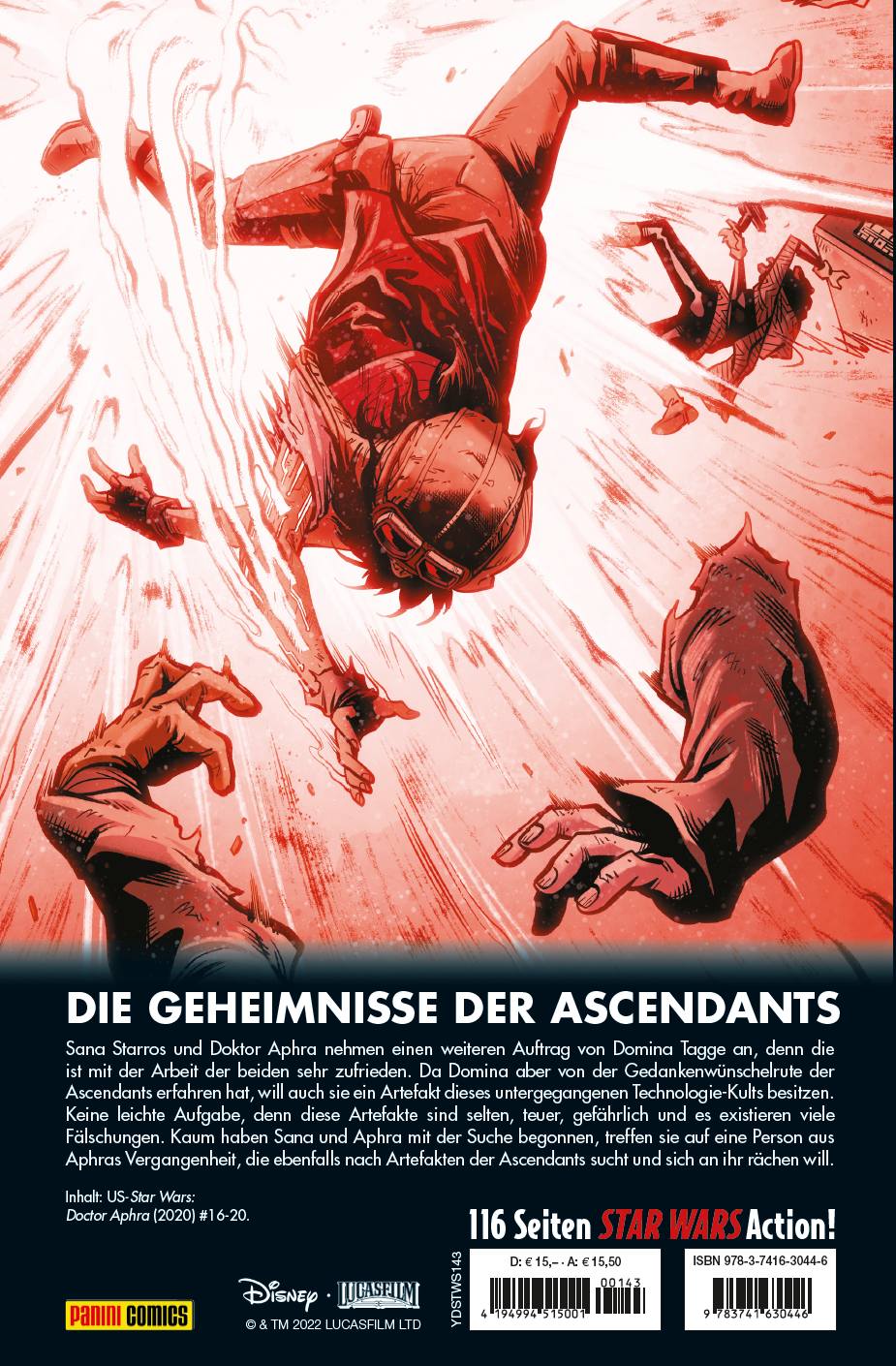 DIE GEHEIMNISSE DER ASCENDANTS Sana Starros und Doktor Aphra nehmen einen weiteren Auftrag von Domina Tagge an, denn die ist mit der Arbeit der beiden sehr zufrieden. Da Domina aber von der Gedankenwünschelrute der Ascendants erfahren hat, will auch sie ein Artefakt dieses untergegangenen Technologie-Kults besitzen. Keine leichte Aufgabe, denn diese Artefakte sind selten, teuer, gefährlich und es existieren viele Fälschungen. Kaum haben Sana und Aphra mit der Suche begonnen, treffen sie auf eine Person aus Aphras Vergangenheit, die ebenfalls nach Artefakten der Ascendants sucht und sich an ihr rächen will. Inhalt: US-Star Wars: Doctor Aphra (2020) #16-20