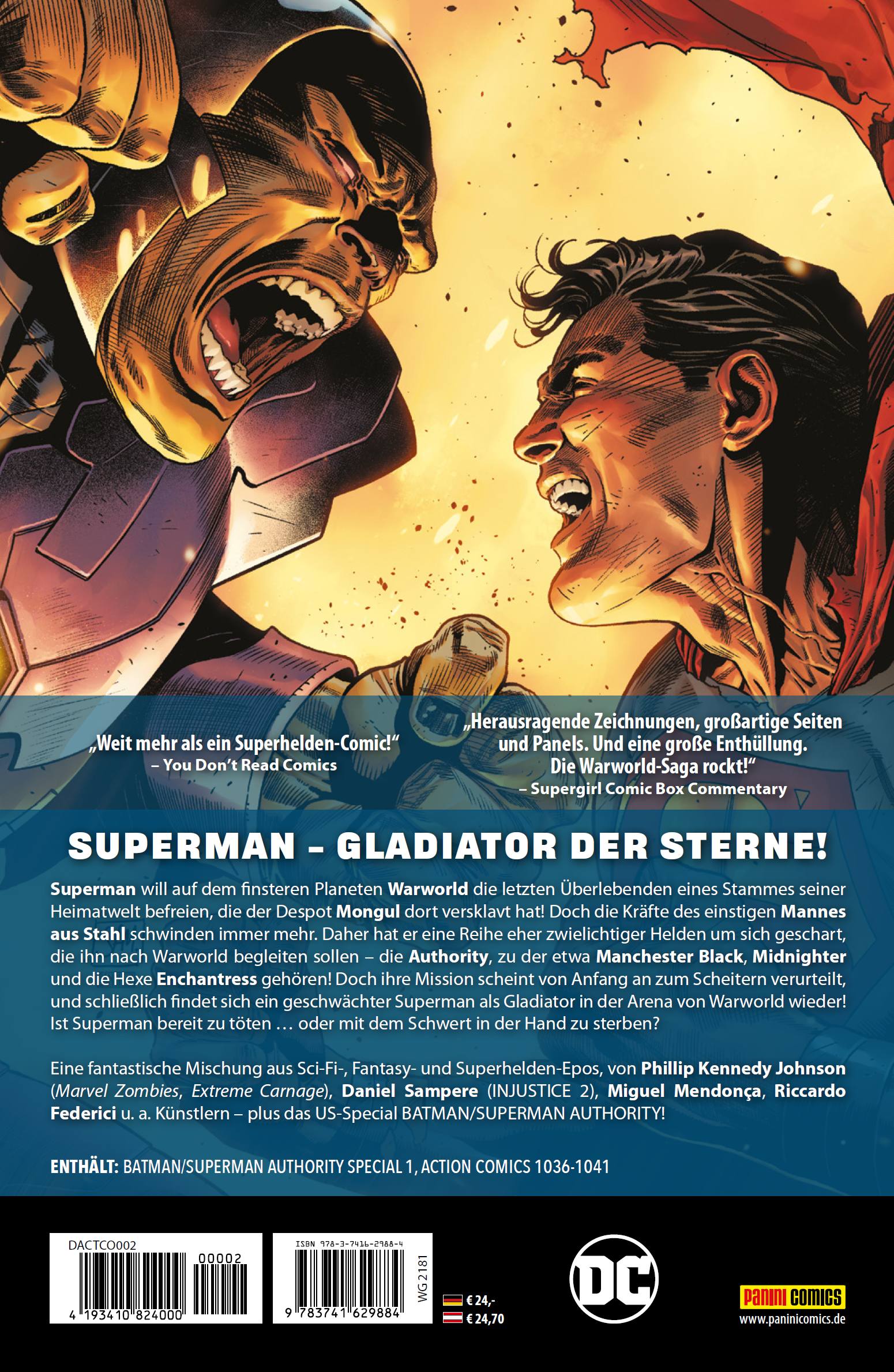 SUPERMAN - GLADIATOR DER STERNE!Superman will auf dem finsteren Planeten Warworld die letzten Überlebenden eines Stammes seiner Heimatwelt befreien, die der Despot Mongul dort versklavt hat! Doch die Kräfte des einstigen Mannes aus Stahl schwinden immer mehr. Daher hat er eine Reihe eher zwielichtiger Helden um sich geschart, die ihn nach Warworld begleiten sollen - die Authority, zu der etwa Manchester Black, Midnighter und die Hexe Enchantress gehören! Doch ihre Mission scheint von Anfang an zum Scheitern verurteilt, und schließlich findet sich ein geschwächter Superman als Gladiator in der Arena von Warworld wieder! Ist Superman bereit zu töten ... oder mit dem Schwert in der Hand zu sterben?Eine fantastische Mischung aus SciFi-, Fantasy- und Superhelden-Epos, von Phillip Kennedy Johnson (Marvel Zombies, Extreme Carnage), Daniel Sampere (INJUSTICE 2), Miguel Mendonça, Riccardo Federici u. a. Künstlern - plus das US-Special BATMAN/SUPERMAN AUTHORITY!ENTHÄLT: BATMAN/SUPERMAN AUTHORITY SPECIAL 1, ACTION COMICS 1036-1041