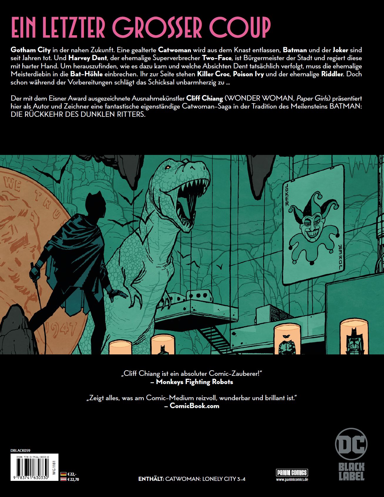 EIN LETZTER GROSSER COUPGotham City in der nahen Zukunft. Eine gealterte Catwoman ist aus dem Knast entlassen, Batman und der Joker sind seit Jahren tot. Und Harvey Dent, der ehemalige Superverbrecher Two-Face, ist Bürgermeister der Stadt und regiert diese mit harter Hand. Um herauszufinden, wie es dazu kam und welche Absichten Dent tatsächlich verfolgt, muss die ehemalige Meisterdiebin in die Bat-Höhle einbrechen. Ihr zur Seite stehen Killer Croc, Poison Ivy und der ehemalige Riddler. Doch schon bei den Vorbereitungen schlägt das Schicksal unbarmherzig zu...Der mit dem Eisner Award ausgezeichnete Ausnahmekünstler Cliff Chiang (WONDER WOMAN, Paper Girls) präsentiert hier als Autor und Zeichner eine fantastische eigenständige Catwoman-Saga in der Tradition des Meilensteins BATMAN: DIE RÜCKKEHR DES DUNKLEN RITTERS.ENTHÄLT: CATWOMAN: LONELY CITY 3-4