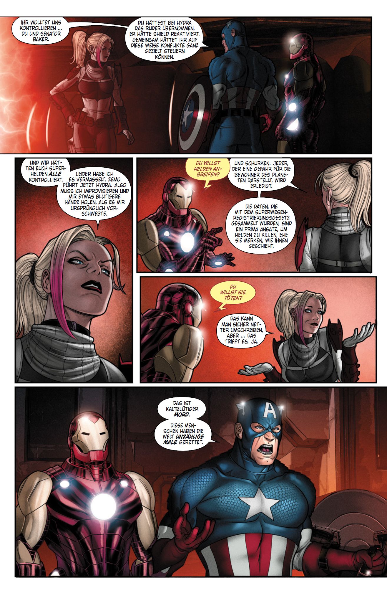 VORWORT von Thomas Witzler Vor einigen Jahren kam es in der Kleinstadt Stamford zu einer Katastrophe. In Begleitung eines Kamerateams, das live auf Sendung war, bekämpften die New Warriors einige Superschurken, als die menschliche Bombe Nitro in einem Wohngebiet explodierte. Die Detonation kostete 600 Personen das Leben, darunter befanden sich auch 60 Kinder. Infolgedessen erließ die Regierung ein Gesetz, das Superwesen zwang, sich staatlich registrieren zu lassen. Wer die neuen Regeln nicht befolgte, wurde gnadenlos verfolgt und landete letztlich in einem Spezialgefängnis. Während Iron Man die Maßnahmen vollauf unterstützte, sah Captain America individuelle Freiheits- und Persönlichkeitsrechte in Gefahr. Der Disput führte in Civil War sowohl zum Bruch zwischen Stark und Rogers als auch zum Krieg der Helden, was 2016 verfilmt wurde. Mittlerweile haben die beiden langjährigen Avengers ihre Differenzen beigelegt. Trotzdem kämpfen sie heute erstmals Seite an Seite in einem Band, der ihrer beider Namen ziert. Das gemeinsame Abenteuer hat seine Wurzeln in FALCON & WINTER SOLDIER: FALSCHE SCHLANGE. Veronica Eden überwachte im Dienst der Regierung undercover die Personalbeschaffung von Terrororganisationen. In Wahrheit war sie auch für Hydra tätig. Eden überreichte Baron Zemo heimlich eine Liste potenzieller Kandidaten und akquirierte für einen Putsch gleichzeitig eigene, vielversprechende Rekruten. Das falsche Spiel lief aus dem Ruder, als einer ihrer Agenten, der verrückte jugendliche Captain America-Fan namens Natural, alle Staatsdiener in ihrem Büro ermordete. Das Massaker rief schließlich Falcon und Winter Soldier auf den Plan. Die beiden Helden fanden sich rasch in einem chaotischen Machtkampf um Hydras Thron zwischen Eden und Zemo wieder, der durch ein Geflecht aus Intrigen, Lügen und Verrat immer undurchsichtiger wurde. Während Eden und Natural nach langem Hin und Her verhaftet wurden, gelang Zemo die Flucht. Aber Edens Geschichte ist damit noch nicht am Ende angelangt …