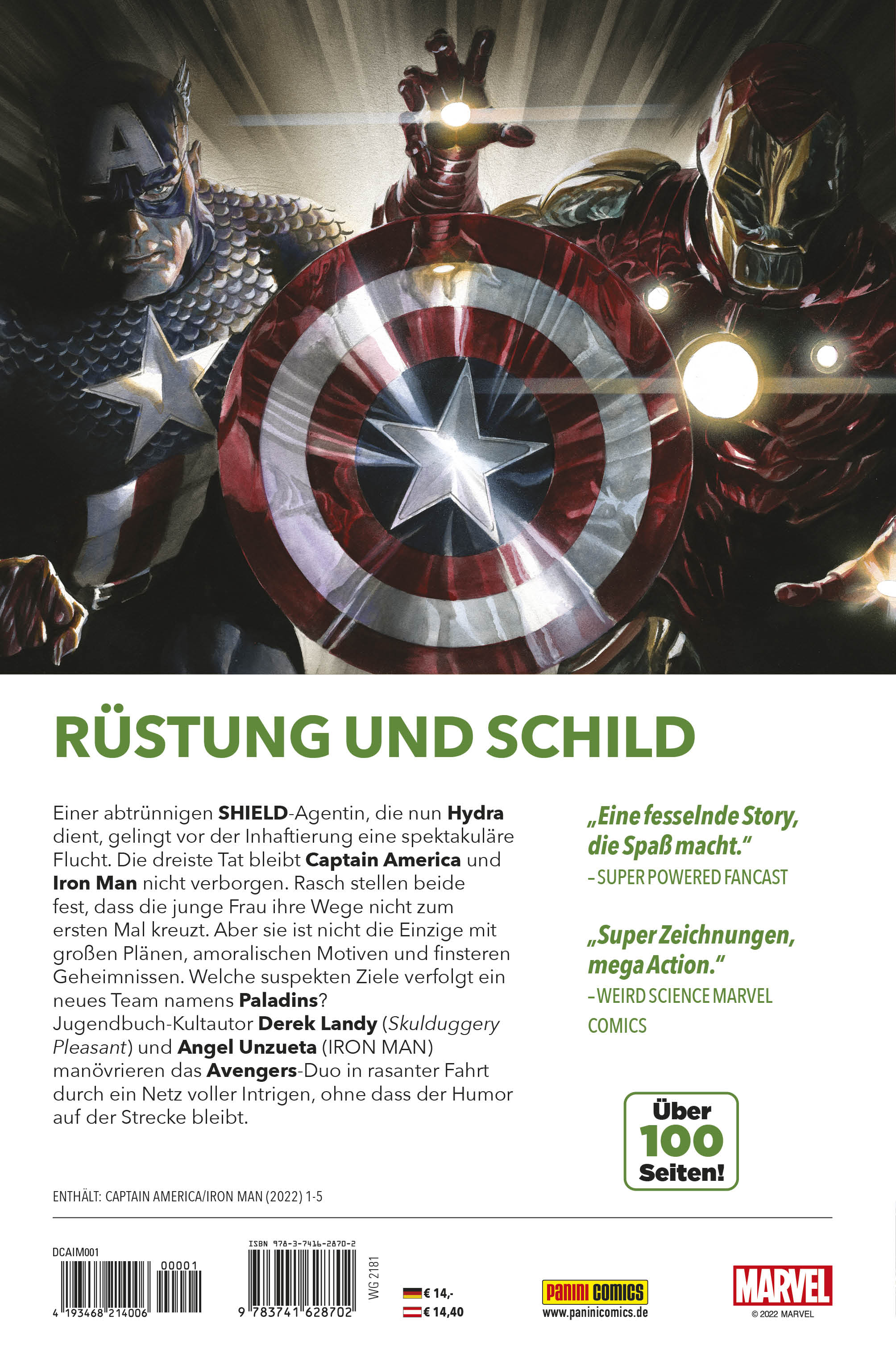 RÜSTUNG UND SCHILDEiner abtrünnigen SHIELD-Agentin, die nun Hydra dient, gelingt vor der Inhaftierung eine spektakuläre Flucht. Die dreiste Tat bleibt Captain America und Iron Man nicht verborgen. Rasch stellen beide fest, dass die junge Frau ihre Wege nicht zum ersten Mal kreuzt. Aber sie ist nicht die Einzige mit großen Plänen, amoralischen Motiven und finsteren Geheimnissen. Welche suspekten Ziele verfolgt ein neues Team namens Paladins?Jugendbuch-Kultautor Derek Landy (Skulduggery Pleasant) und Angel Unzueta (IRON MAN) manövrieren das Avengers-Duo in rasanter Fahrt durch ein Netz voller Intrigen, ohne dass der Humor auf der Strecke bleibt.ENTHÄLT: CAPTAIN AMERICA/IRON MAN (2022) 1-5