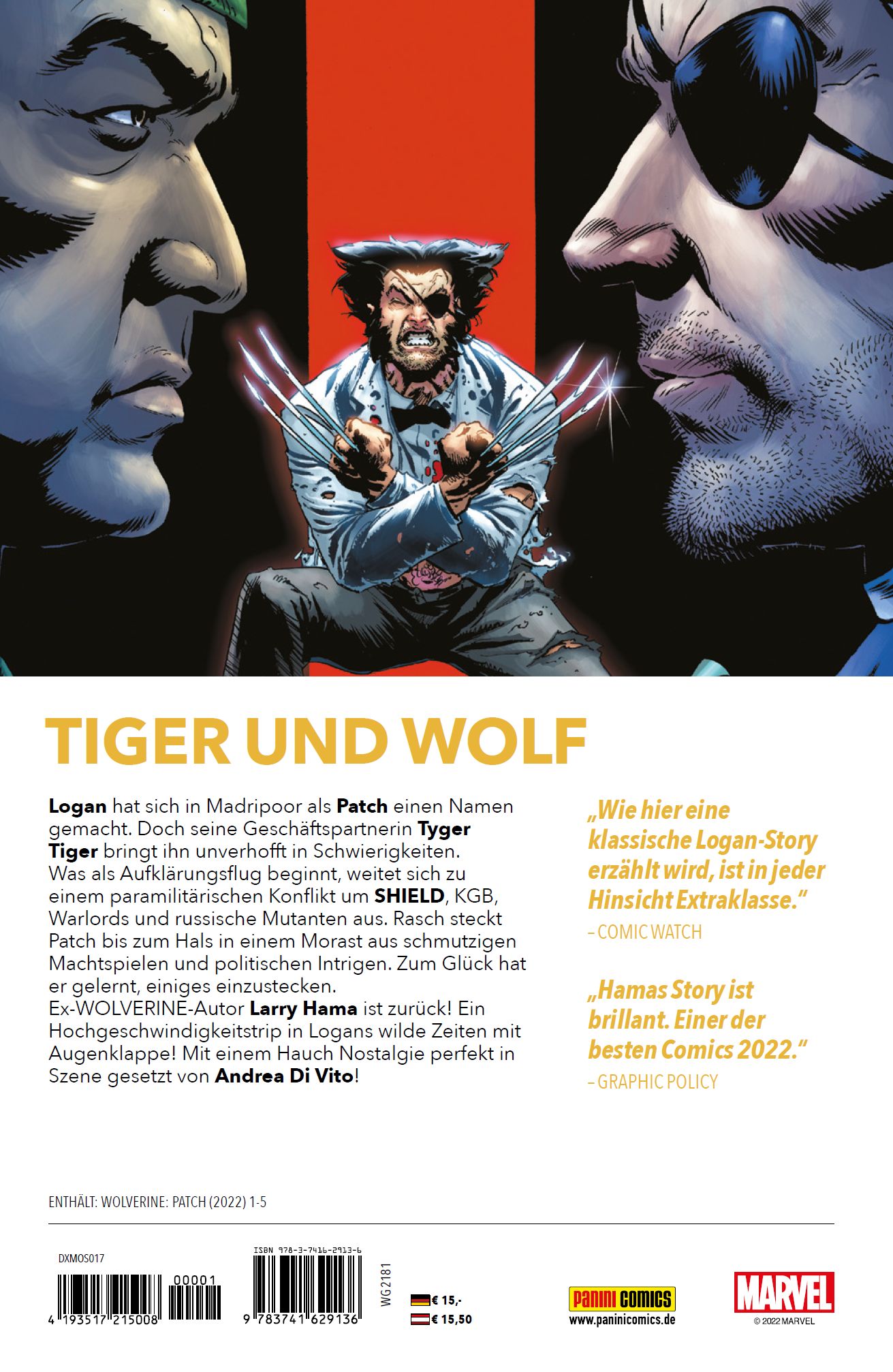 TIGER UND WOLFLogan hat sich in Madripoor als Patch einen Namen gemacht. Doch seine Geschäftspartnerin Tyger Tiger bringt ihn unverhofft in Schwierigkeiten. Was als Aufklärungsfl ug beginnt, weitet sich zu einem paramilitärischen Konfl ikt um SHIELD, KGB, Warlords und russische Mutanten aus. Rasch steckt Patch bis zum Hals in einem Morast aus schmutzigen Machtspielen und politischen Intrigen. Zum Glück hat er gelernt, einiges einzustecken. Ex-WOLVERINE-Autor Larry Hama ist zurück! Ein Hochgeschwindigkeitstrip in Logans wilde Zeiten mit Augenklappe! Mit einem Hauch Nostalgie perfekt in Szene gesetzt von Andrea Di Vito!ENTHÄLT: WOLVERINE: PATCH (2022) 1-5