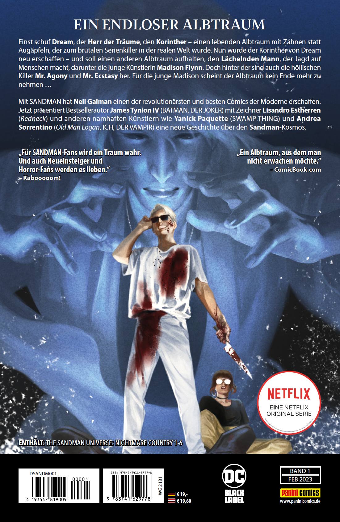 EIN ENDLOSER ALBTRAUMEinst schuf Dream, der Herr der Träume, den Korinther - einen lebenden Albtraum mit Zähnen statt Augäpfeln, der zum brutalen Serienkiller in der realen Welt wurde. Nun wurde der Korinther von Dream neu erschaffen - und soll einen anderen Albtraum aufhalten, den Lächelnden Mann, der Jagd auf Menschen macht, darunter die junge Künstlerin Madison Flynn. Doch hinter der sind auch die höllischen Killer Mr. Agony und Mr. Ecstasy her. Für die junge Madison scheint der Albtraum kein Ende mehr zu nehmen...Mit SANDMAN hat Neil Gaiman einen der revolutionärsten und besten Comics der Moderne erschaffen. Jetzt präsentiert Bestsellerautor James Tynion IV (BATMAN, DER JOKER) mit Zeichner Lisandro Estherren (Redneck) und anderen namhaften Künstlern wie Yanick Paquette (SWAMP THING) und Andrea Sorrentino (Old Man Logan, ICH, DER VAMPIR) eine neue Geschichte über den Sandman-Kosmos.ENTHÄLT: THE SANDMAN UNIVERSE: NIGHTMARE COUNTRY 1-6