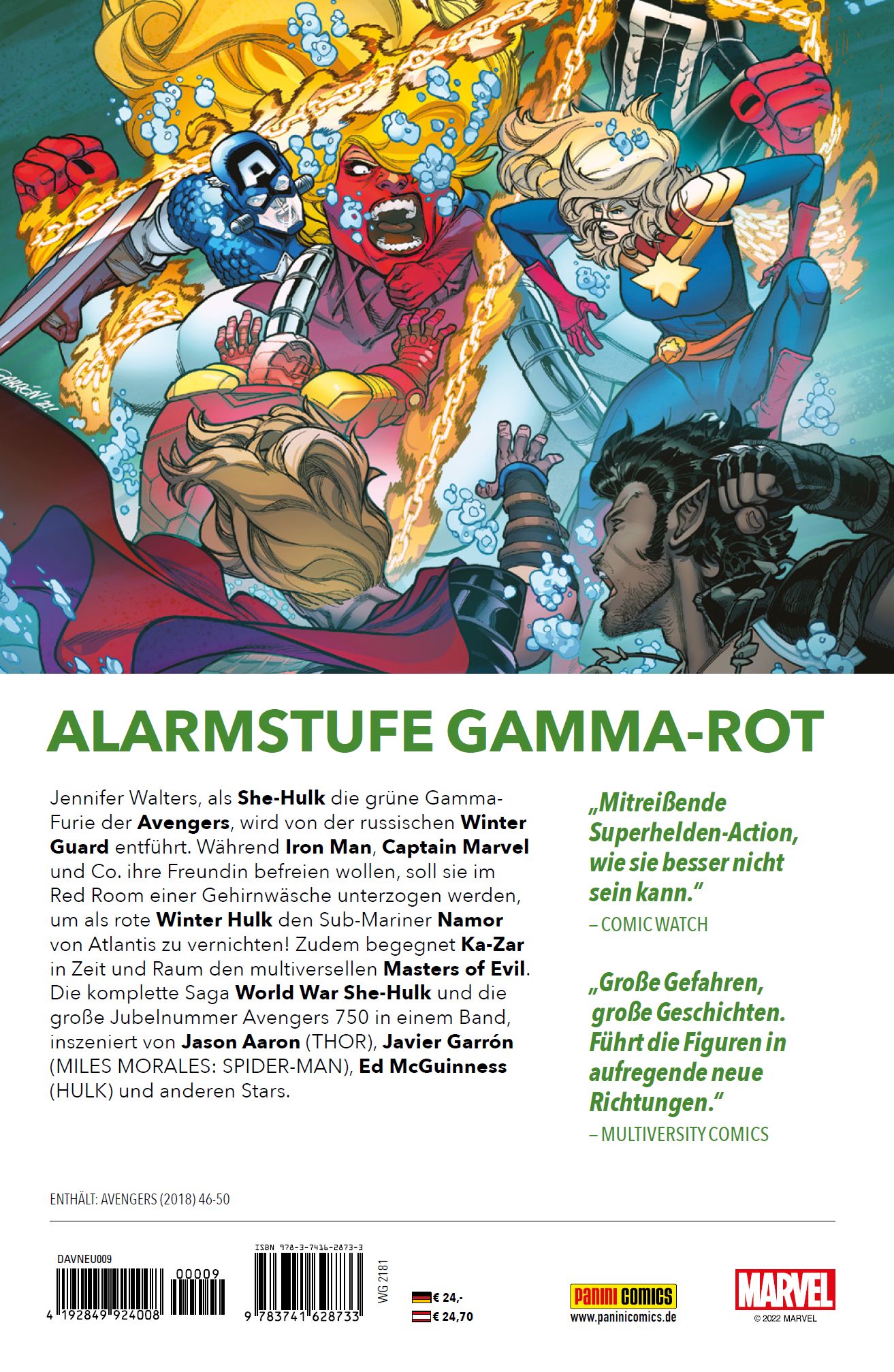 ALARMSTUFE GAMMA-ROT Jennifer Walters, als She-Hulk die grüne Gamma- Furie der Avengers, wird von der russischen Winter Guard entführt. Während Iron Man, Captain Marvel und Co. ihre Freundin befreien wollen, soll sie im Red Room einer Gehirnwäsche unterzogen werden, um als rote Winter Hulk den Sub-Mariner Namor von Atlantis zu vernichten! Zudem begegnet Ka-Zar in Zeit und Raum den multiversellen Masters of Evil. Die komplette Saga World War She-Hulk und die große Jubelnummer Avengers 750 in einem Band, inszeniert von Jason Aaron (THOR), Javier Garrón (MILES MORALES: SPIDER-MAN), Ed McGuinness (HULK) und anderen Stars. ENTHÄLT: AVENGERS (2018) 46-50