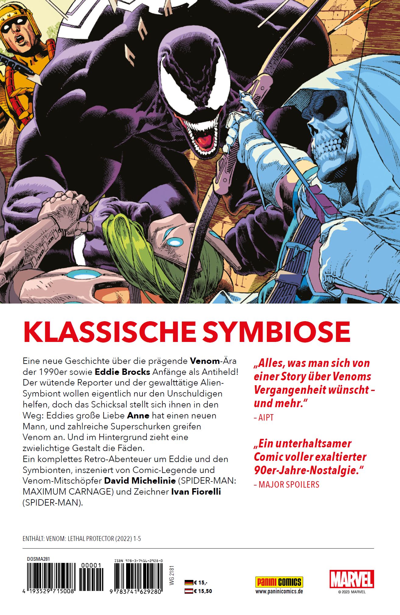 KLASSISCHE SYMBIOSEEine neue Geschichte über die prägende Venom-Ära der 1990er sowie Eddie Brocks Anfänge als Antiheld! Der wütende Reporter und der gewalttätige Alien-Symbiont wollen eigentlich nur den Unschuldigen helfen, doch das Schicksal stellt sich ihnen in den Weg: Eddies große Liebe Anne hat einen neuen Mann, und zahlreiche Superschurken greifen Venom an. Und im Hintergrund zieht eine zwielichtige Gestalt die Fäden. Ein komplettes Retro-Abenteuer um Eddie und den Symbionten, inszeniert von Comic-Legende und Venom-Mitschöpfer David Michelinie (SPIDER-MAN: MAXIMUM CARNAGE) und Zeichner Ivan Fiorelli (SPIDER-MAN).ENTHÄLT: VENOM: LETHAL PROTECOR (2022) 1-5