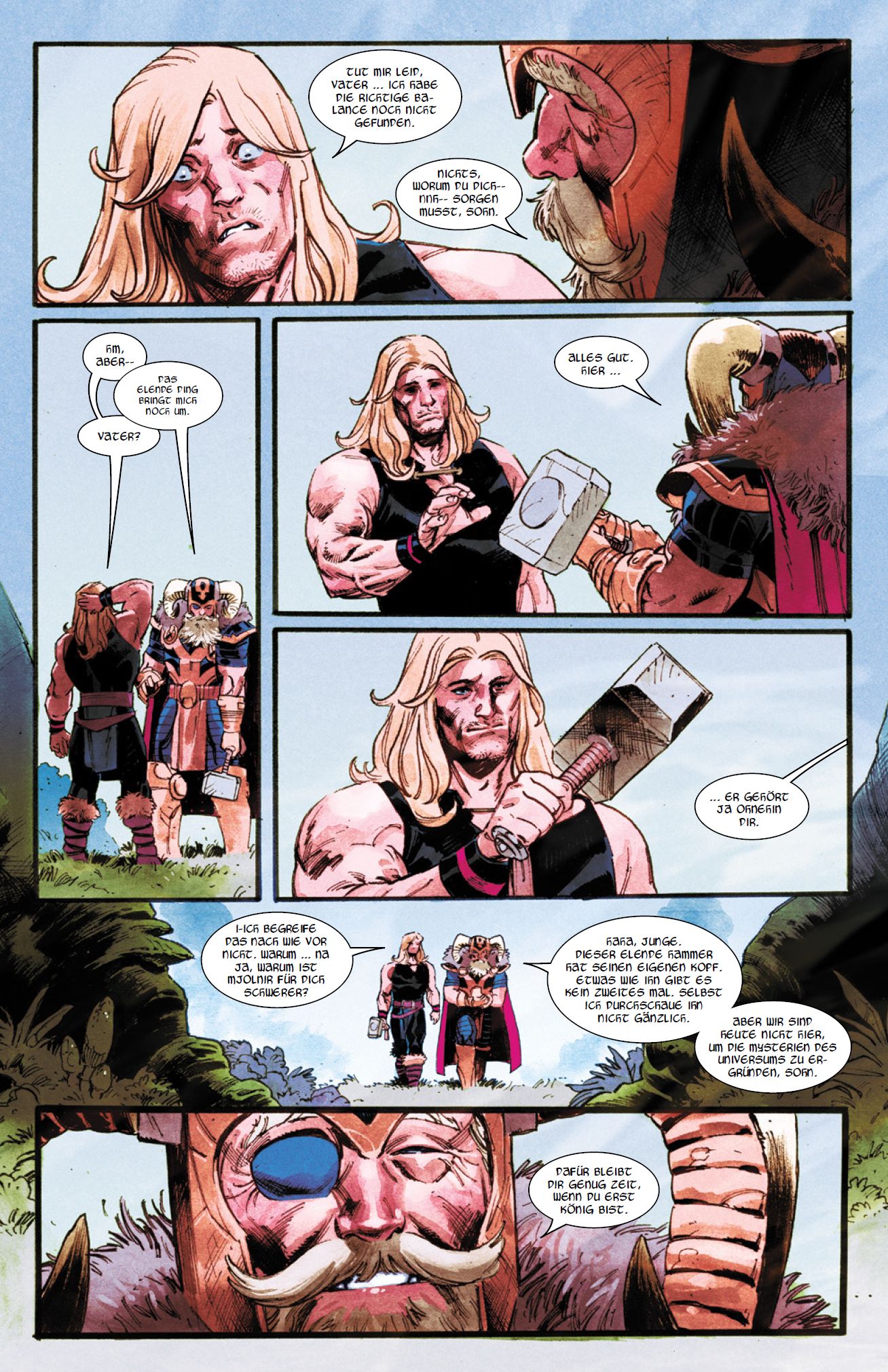 VORWORT von Thomas Witzler Alles begann vor 60 Jahren in einer Höhle mit einem Stock und einem gehbehinderten Arzt. Doch der Stock war in Wirklichkeit ein verzauberter, mächtiger Hammer. Und er verwandelte Dr. Donald Blake in den Donnergott der germanischen Sagen. Aber das ist nur ein Teil einer weit komplexeren Geschichte, wie wir kürzlich erfahren haben. Vor ewiger Zeit überreichten die Zwerge von Nidavellir Odin einen Klumpen Uru. Es war ein Geschenk an den frisch gekrönten Allvater, da er sie vor einem Angriff der Trolle gerettet hatte. Irgendwann danach musste Odin das goldene Reich mehrere Tage gegen einen verheerend starken, kosmischen Sturm verteidigen. Als der Göttersturm, auch Mutter des Donners genannt, schwach genug war, schloss er das Element im Uru-Klumpen ein. Auf Odins Geheiß schmiedeten die Zwerge Eitri, Brokk und Buri aus dem Metall den Hammer Mjolnir. Sie benötigten 17 Wochen und die Hitze eines sterbenden Sterns, um ihr Werk zu vollenden. Während ihrer Arbeit explodierte der Planet und riss nicht nur Midgard fast mit sich ins Verderben, sondern vermutlich auch die Dinosaurier. Aufgrund des Göttersturms gebärdete sich das Artefakt zuerst wie ein wilder Stier und ließ sich kaum von Odin bändigen. Außer Kontrolle geraten, legte es Asgard in Schutt und Asche. Aus Trotz belegte Odin den Hammer mit einem Zauber, um zu verhindern, dass ihn jemand anders tragen konnte. Unzählige Jahre lag Mjolnir unberührt in Asgards Waffenkammer, bis der Göttersturm erstarb. Aber seine Macht blieb dem Hammer erhalten. Zusätzlich verstärkte ihn Odin mit mehreren wirkungsvollen Sprüchen. Bevor der Allvater die Waffe schließlich seinem Sohn Thor vermachte, musste sich der Junge ihrer durch diverse Prüfungen würdig erweisen. Seit der Donnergott seinen Vater auf Asgards Thron beerbt hat, scheint sein Verhältnis zu Mjolnir belastet zu sein. Manchmal konnte er ihn einfach nicht anheben. Andere Male war jeder in der Lage, ihn zu tragen. Nun ist der Hammer verschwunden. Doch damit ist seine Geschichte noch nicht am Ende angelangt.