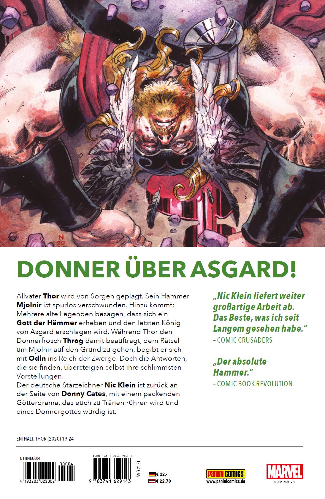DONNER ÜBER ASGARD! Allvater Thor wird von Sorgen geplagt. Sein Hammer Mjolnir ist spurlos verschwunden. Hinzu kommt: Mehrere alte Legenden besagen, dass sich ein Gott der Hämmer erheben und den letzten König von Asgard erschlagen wird. Während Thor den Donnerfrosch Throg damit beauftragt, dem Rätsel um Mjolnir auf den Grund zu gehen, begibt er sich mit Odin ins Reich der Zwerge. Doch die Antworten, die sie finden, übersteigen selbst ihre schlimmsten Vorstellungen. Der deutsche Starzeichner Nic Klein ist zurück an der Seite von Donny Cates, mit einem packenden Götterdrama, das euch zu Tränen rühren wird und eines Donnergottes würdig ist. ENTHÄLT: THOR (2020) 19-24