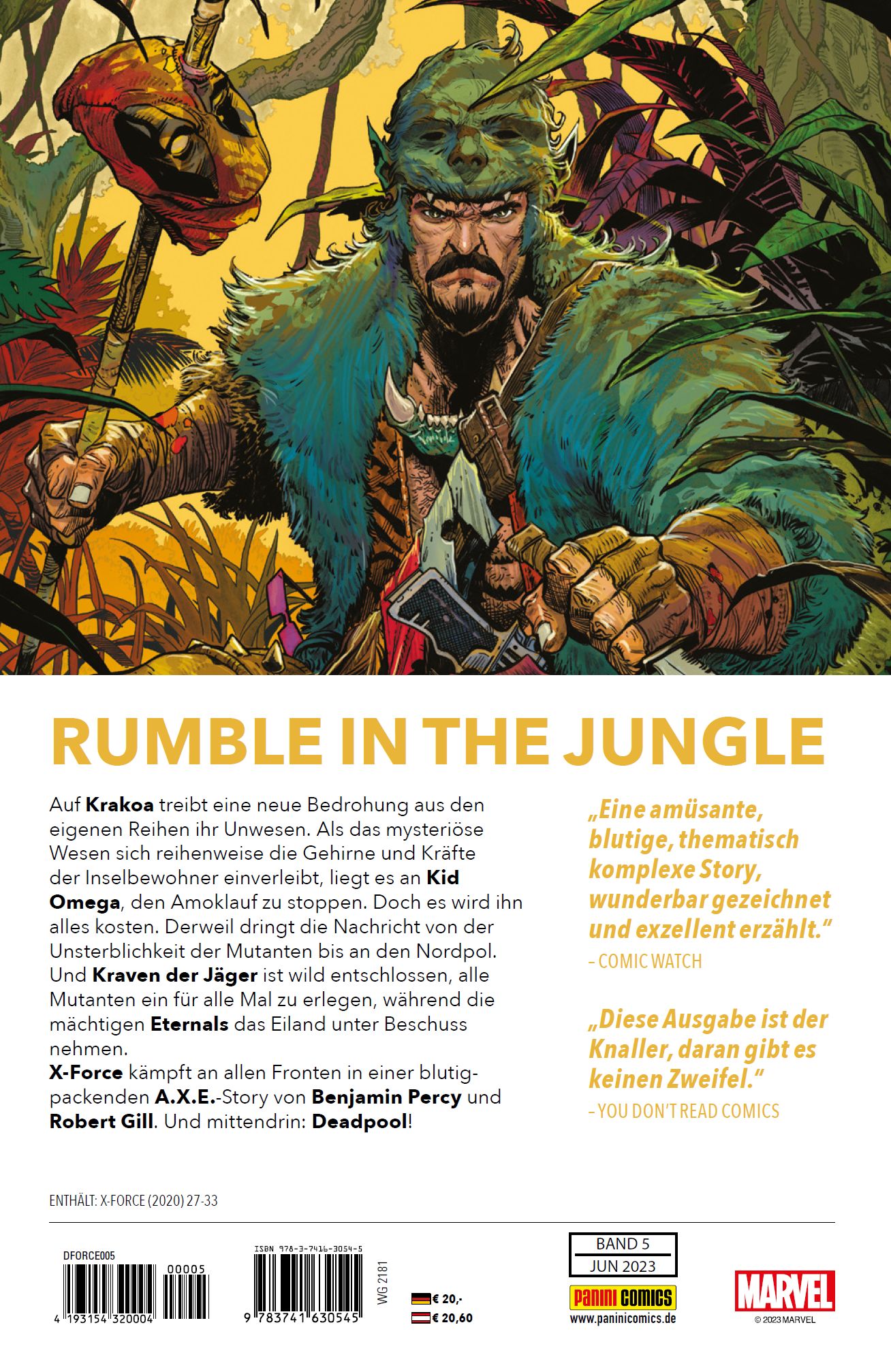 RUMBLE IN THE JUNGLEAuf Krakoa treibt eine neue Bedrohung aus den eigenen Reihen ihr Unwesen. Als das mysteriöse Wesen sich reihenweise die Gehirne und Kräfte der Inselbewohner einverleibt, liegt es an Kid Omega, den Amoklauf zu stoppen. Doch es wird ihn alles kosten. Derweil dringt die Nachricht von der Unsterblichkeit der Mutanten bis an den Nordpol. Und Kraven der Jäger ist wild entschlossen, alle Mutanten ein für alle Mal zu erlegen, während die mächtigen Eternals das Eiland unter Beschuss nehmen.X-Force kämpft an allen Fronten in einer blutig-packenden A.X.E.-Story von Benjamin Percy und Robert Gill. Und mittendrin: Deadpool!ENTHÄLT: X-FORCE (2020) 27-33