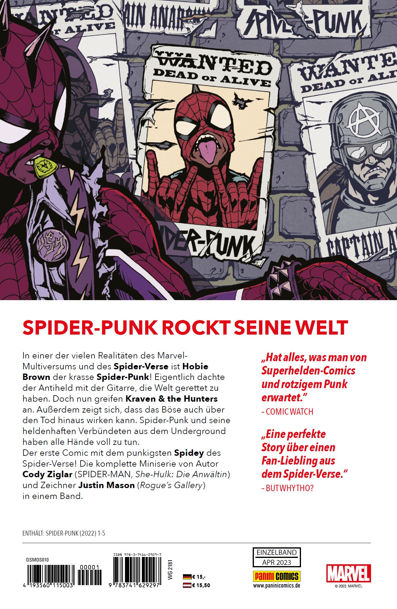 SPIDER-PUNK ROCKT SEINE WELTIn einer der vielen Realitäten des Marvel-Multiversums und des Spider-Verse ist Hobie Brown der krasse Spider-Punk! Eigentlich dachte der Antiheld mit der Gitarre, die Welt gerettet zu haben. Doch nun greifen Kraven & the Hunters an. Außerdem zeigt sich, dass das Böse auch über den Tod hinaus wirken kann. Spider-Punk und seine heldenhaften Verbündeten aus dem Underground haben alle Hände voll zu tun. Der erste Comic mit dem punkigsten Spidey des Spider-Verse! Die komplette Miniserie von Autor Cody Ziglar (SPIDER-MAN, She-Hulk: Die Anwältin) und Zeichner Justin Mason (Rogue's Gallery) in einem Band.ENTHÄLT: SPIDER-PUNK (2022) 1-5