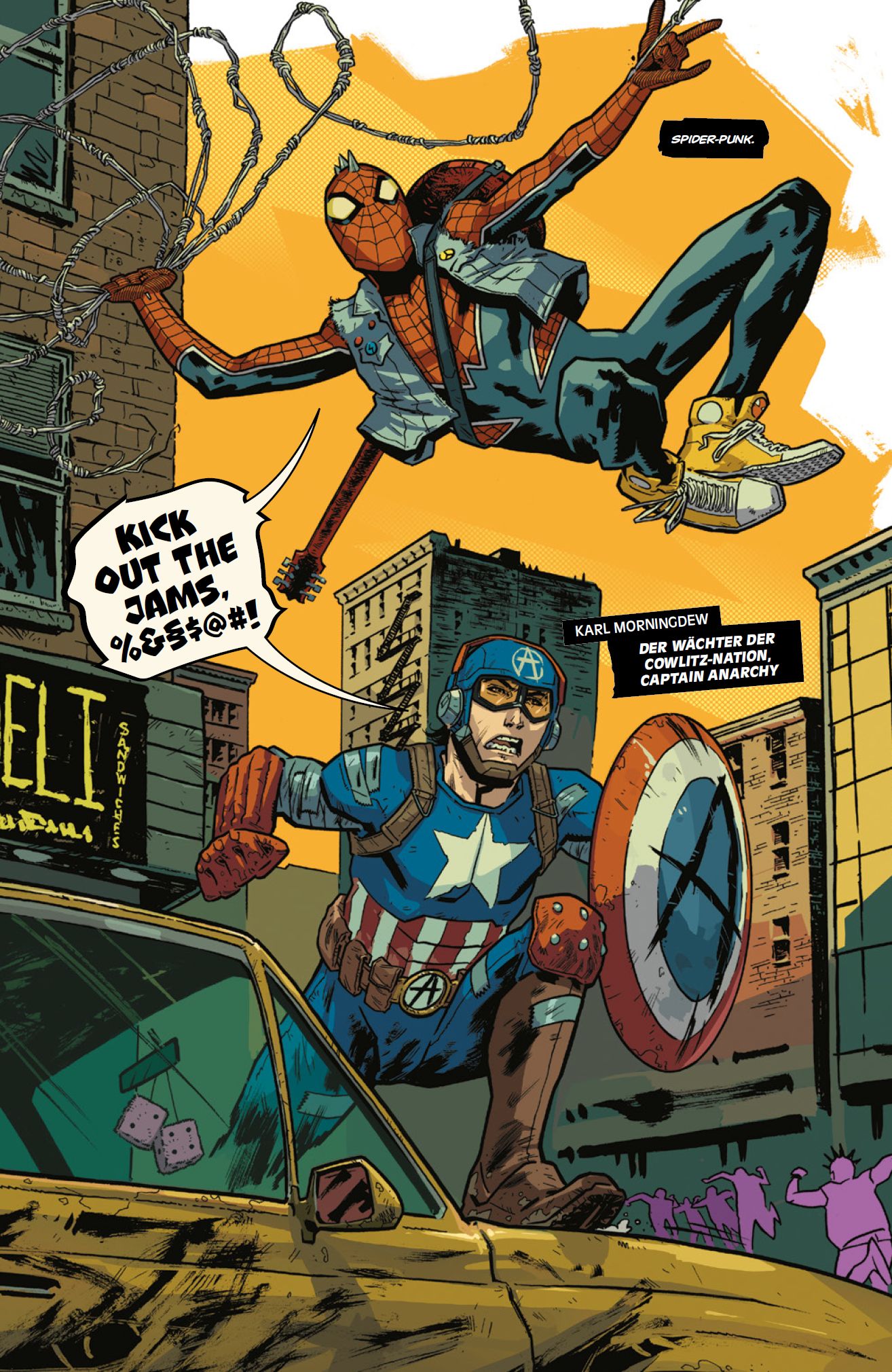 VORWORT von Christian Endres Wie wir wissen, besteht das Marvel-Multiversum aus vielen parallel existierenden Universen, Dimensionen, Wirklichkeiten und Welten. Dabei können die Legenden und Geschichten der größten Marvel-Ikonen in diesen alternativen Realitäten komplett anders aussehen, einen völlig anderen Verlauf nehmen und ganz anders daherkommen als gewohnt. 2014 inszenierten Autor Dan Slott und andere Kreative außerdem die erste große Spider-Verse-Saga über die Netzschwinger und Wandkrabblerinnen anderer Dimensionen, die durch das Netz von Leben und Schicksal miteinander verbunden sind und in denen explizit die Geschichte von Spidey unerwartete Formen angenommen hat – etwa die von Spider-Woman oder Spider-Man Noir. Damals kamen zahlreiche Heldinnen und Helden im Zeichen der Spinne zusammen, um sich gemeinsam gegen einen gefährlichen Feind zu stellen. Einer der Helden, die sich dem Kampf anschlossen, war Hobie Brown alias Spider-Punk, 2015 von Dan Slott und Zeichner Olivier Coipel für Amazing Spider-Man 10 jener Ära erschaffen. In der Marvel-Hauptrealität kennt man ihn als Erfinder, Fensterputzer, Einbrecher, Superheld, Spider-Man-Double und natürlich als Prowler bzw. als Hornet. Nicht so in der Realität von Erde-138. Dort lebte Hobie als obdachloser Teenager auf der Straße und wurde von einer Spinne gebissen, die durch das Giftmüll-Entsorgungsprogramm des bösen US-Präsidenten Norman Osborn verwandelt wurde. Daraufhin wurde er zum Antihelden Spider-Punk und führte mit Captain Anarchy den Aufstand der New Yorker Bevölkerung gegen Präsident Osborn und dessen Venom- Truppen an. Spider-Punk war es sogar, der den fiesen venomisierten US-Präsidenten mit seiner Gitarre erschlug. Danach demaskierte sich Hobie vor der Menge und den Kameras, wie Autor Jed MacKay und Zeichner Sheldon Vella in einer Event-Kurzgeschichte in Spider- Verse 2 zeigten. Nach seinem Auftritt im darauffolgenden Spidey-Crossover Spider- Geddon ist dies hier Spider-Punks erster langer Solo-Comic. Wir wünschen punkiges Vergnügen …