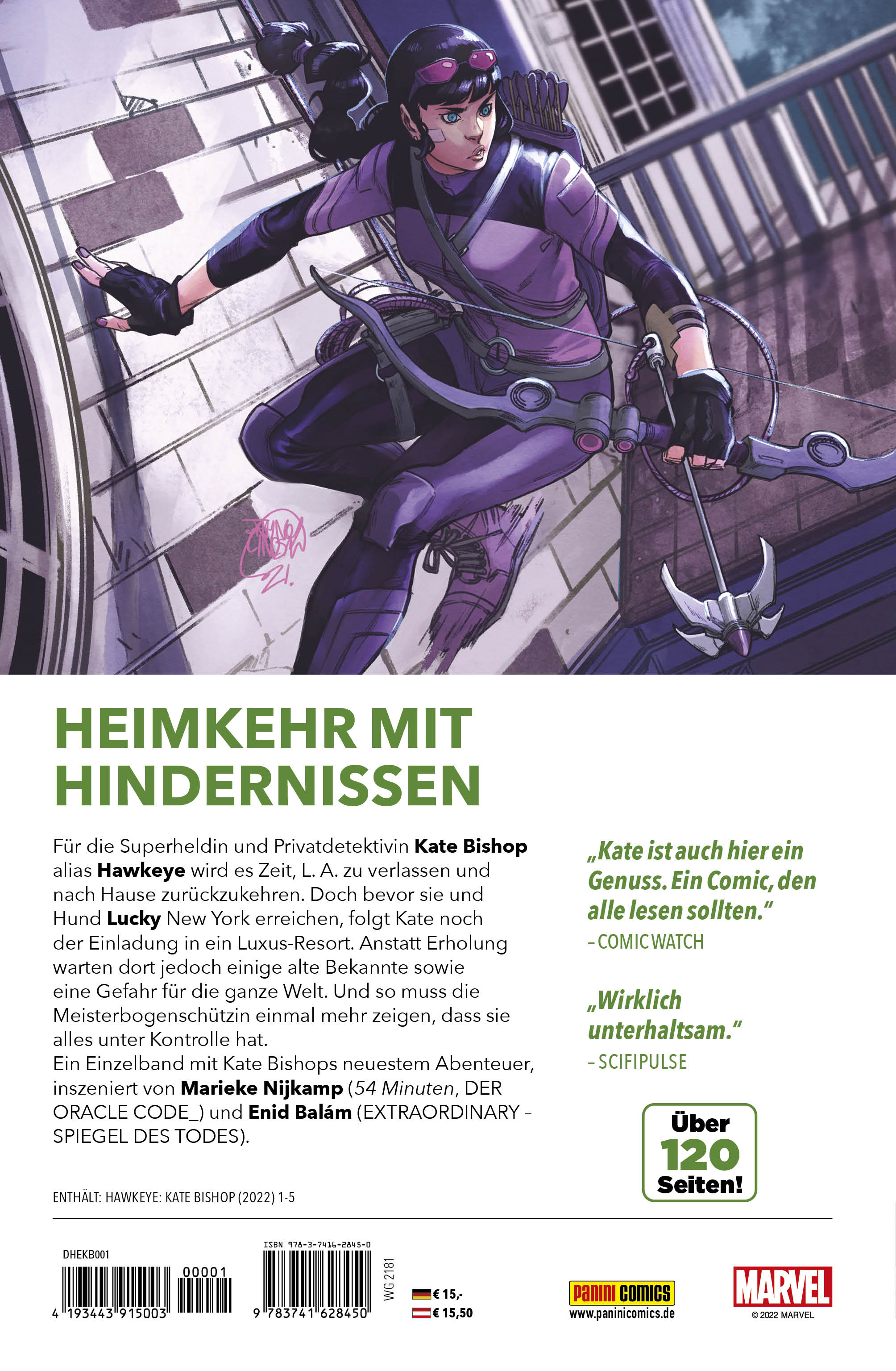 HEIMKEHR MIT HINDERNISSENFür die Superheldin und Privatdetektivin Kate Bishop alias Hawkeye wird es Zeit, L. A. zu verlassen und nach Hause zurückzukehren. Doch bevor sie und Hund Lucky New York erreichen, folgt Kate noch der Einladung in ein Luxus-Resort. Anstatt Erholung warten dort jedoch einige alte Bekannte sowie eine Gefahr für die ganze Welt. Und so muss die Meisterbogenschützin einmal mehr zeigen, dass sie alles unter Kontrolle hat.Ein Einzelband mit Kate Bishops neuestem Abenteuer, inszeniert von Marieke Nijkamp (54 Minuten, DER ORACLE CODE_) und Enid Balám (EXTRAORDINARY - SPIEGEL DES TODES).ENTHÄLT: HAWKEYE: KATE BISHOP (2022) 1-5