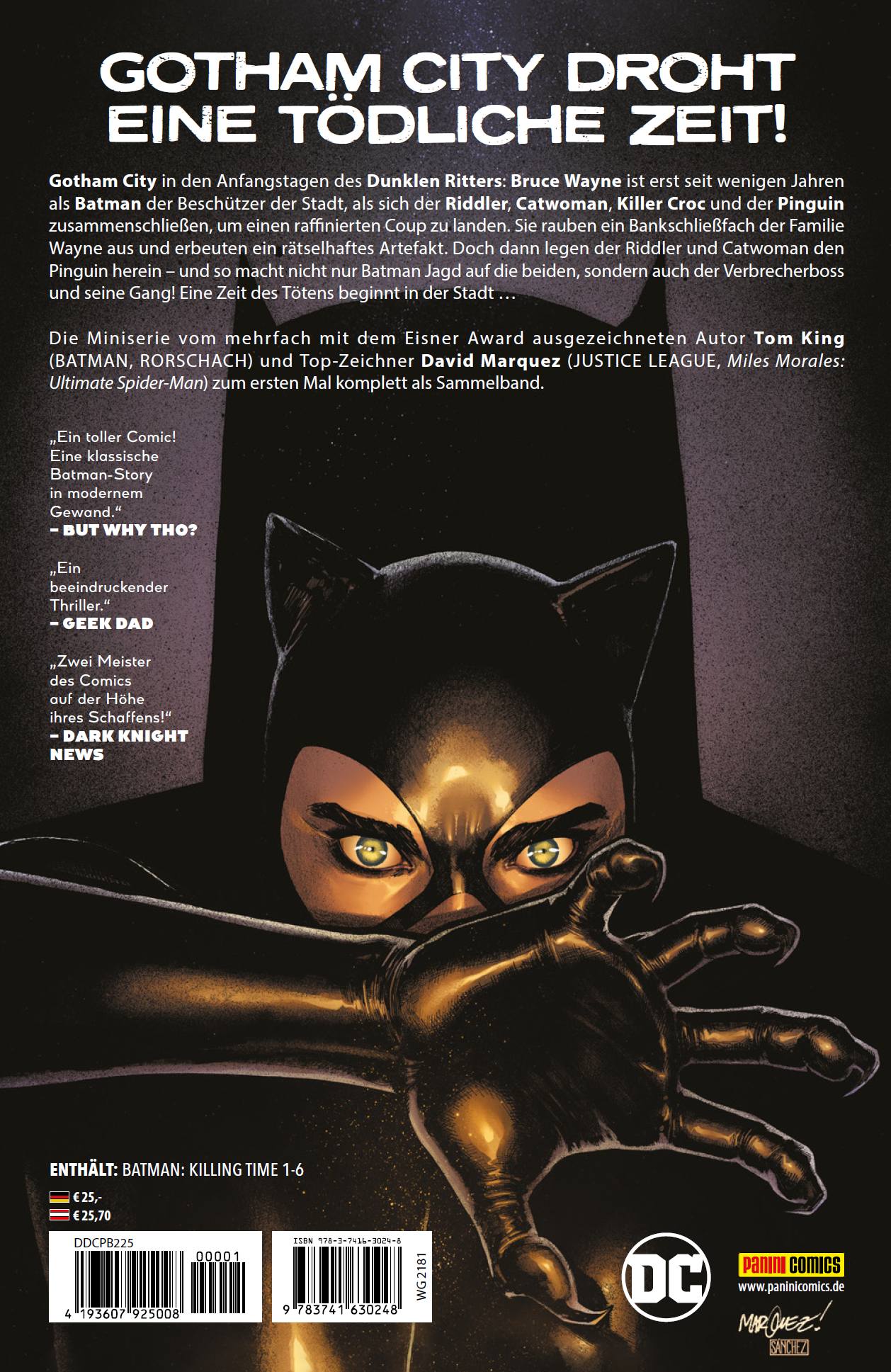 GOTHAM CITY DROHT EINE TÖDLICHE ZEIT! Gotham City in den Anfangstagen des Dunklen Ritters: Bruce Wayne ist erst seit wenigen Jahren als Batman der Beschützer der Stadt, als sich der Riddler, Catwoman, Killer Croc und der Pinguin zusammenschließen, um einen raffinierten Coup zu landen. Sie rauben ein Bankschließfach der Familie Wayne aus und erbeuten ein rätselhaftes Artefakt. Doch dann legen der Riddler und Catwoman den Pinguin herein - und so macht nicht nur Batman Jagd auf die beiden, sondern auch der Verbrecherboss und seine Gang! Eine Zeit des Tötens beginnt in der Stadt ... Die Miniserie vom mehr fach mit dem Eisner Award ausgezeichneten Autor Tom King (BATMAN, RORSCHACH) und Top-Zeichner David Marquez (JUSTICE LEAGUE, Miles Morales: Ultimate Spider-Man) zum ersten Mal komplett als Sammelband. ENTHÄLT: BATMAN: KILLING TIME 1-6