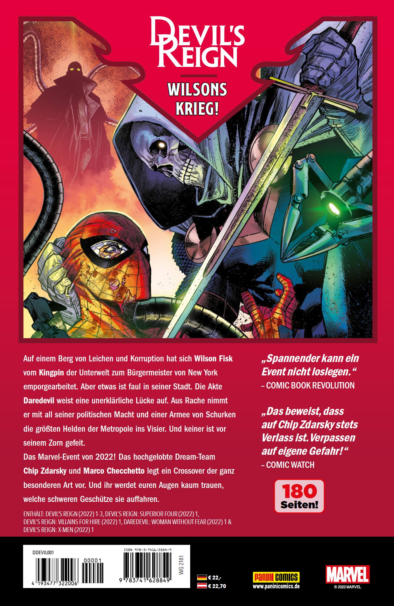 DEVIL'S REIGN - WILSONS KRIEG'!Auf einem Berg von Leichen und Korruption hat sich Wilson Fisk vom Kingpin der Unterwelt zum Bürgermeister von New York emporgearbeitet. Aber etwas ist faul in seiner Stadt. Die Akte Daredevil weist eine unerklärliche Lücke auf. Aus Rache nimmt er mit all seiner politischen Macht und einer Armee von Schurken die größten Helden der Metropole ins Visier. Und keiner ist vor seinem Zorn gefeit. Das Marvel-Event von 2022! Das hochgelobte Dream-Team Chip Zdarsky und Marco Checchetto legen ein Crossover der ganz besonderen Art vor. Und ihr werdet euren Augen kaum trauen, welche schweren Geschütze sie auffahren.ENTHÄLT: DEVIL'S REIGN (2022) 1-3, DEVIL'S REIGN: SUPERIOR FOUR (2022) 1, DEVIL'S REIGN: VILLAINS FOR HIRE (2022) 1, DAREDEVIL: WOMAN WITHOUT FEAR (2022) 1 & DEVIL'S REIGN: X-MEN (2022) 1