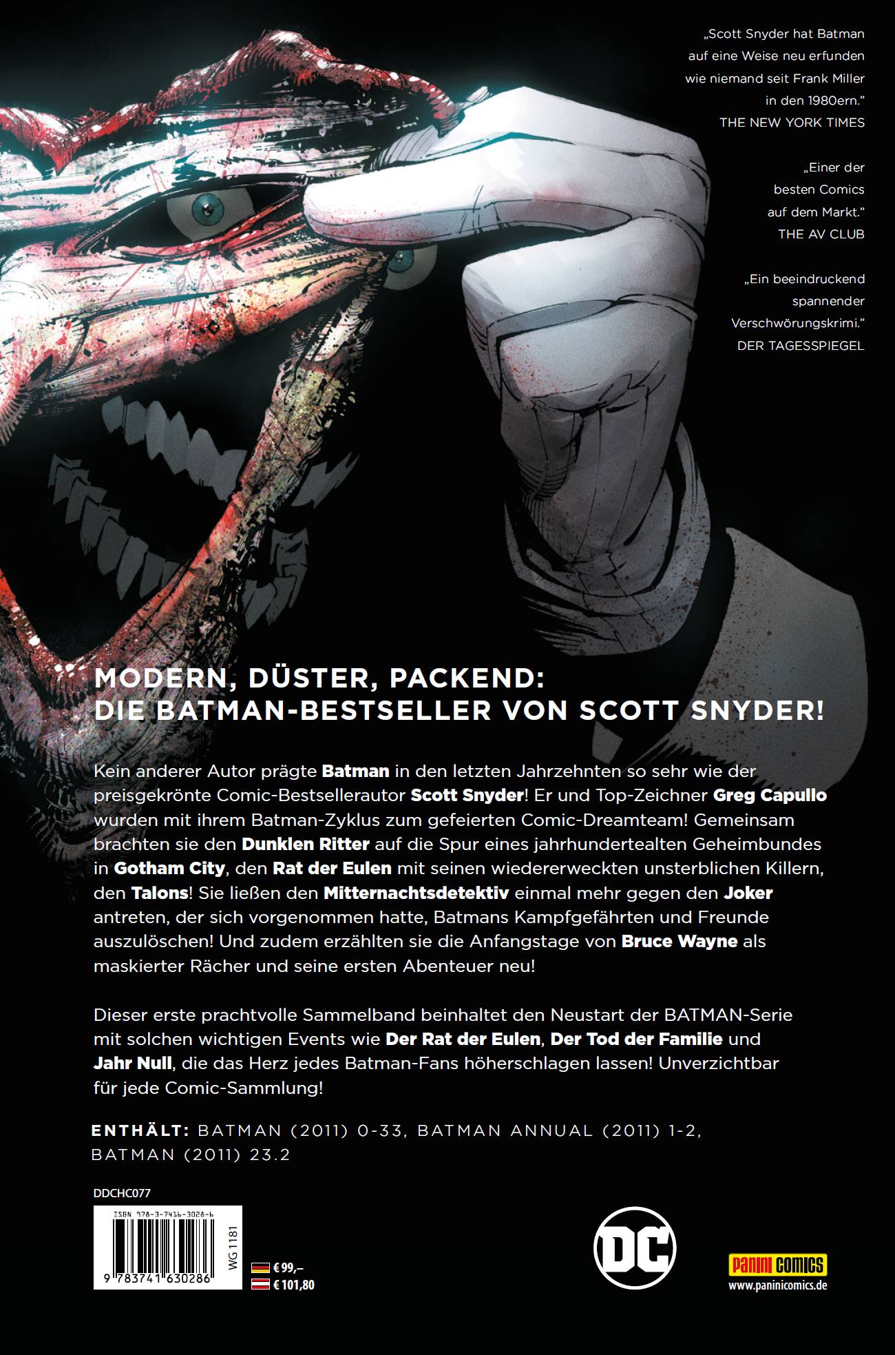 | Schlagworte | Batman Scott Snyder • Bruce Wayne • Comic • Comics • DC • DC-Held • DC-Helden • DC Superheld • DC-Superheld • Deluxe Ausgabe • Deluxe Edition • Deluxe-Edition • Der Rat der Eulen • Der Tod der Familie • Gotham City • Greg Capullo • h22 • Jahr Null • Joker • Mitternachtsdetektiv • Panini • Paninicomics • Panini Comics • Rat der Eulen • Sammelband • Scott Synder • Superheld • Superhelden • talons |