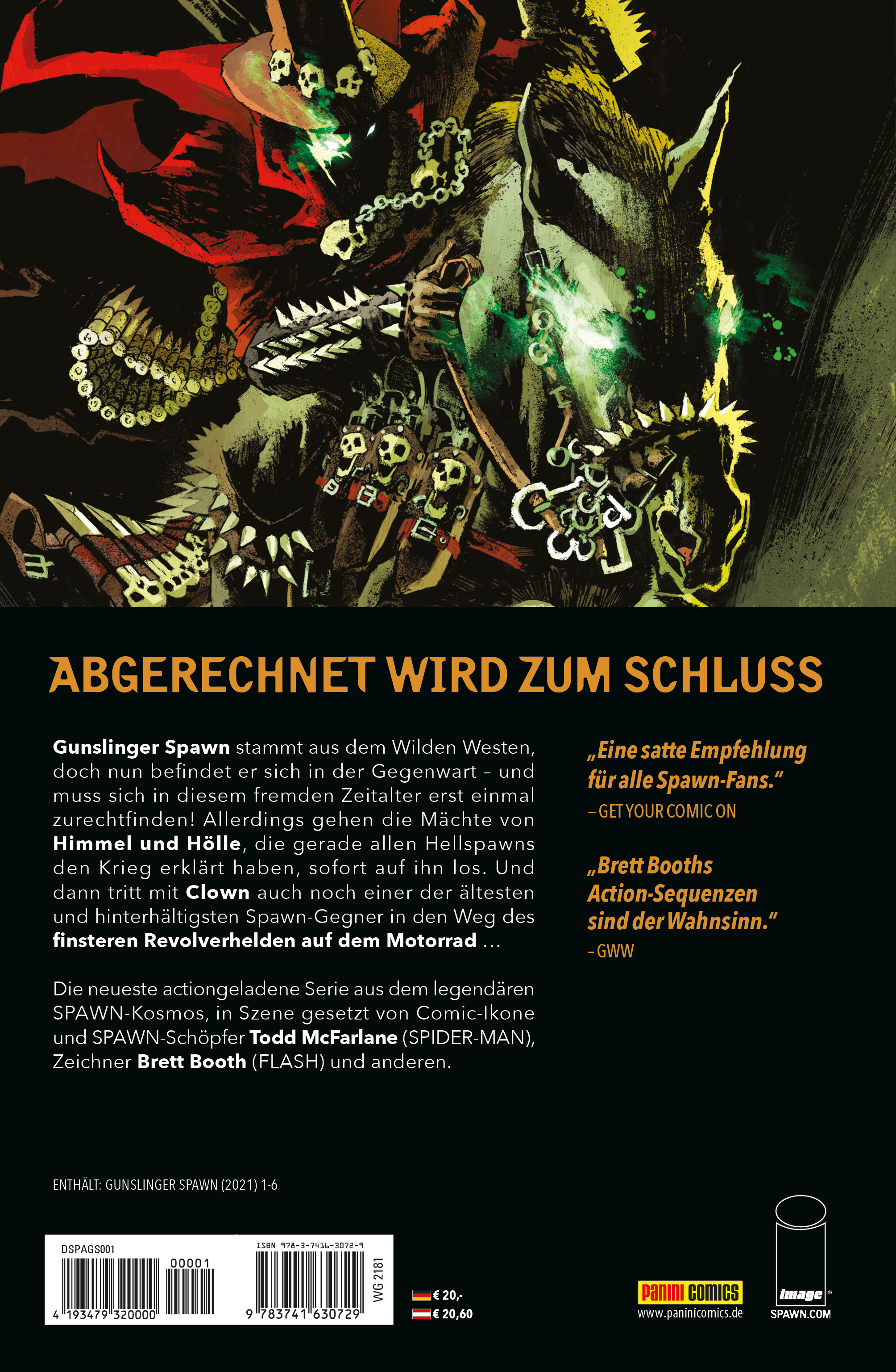ABGERECHNET WIRD ZUM SCHLUSSGunslinger Spawn stammt aus dem Wilden Westen, doch nun befindet er sich in der Gegenwart - und muss sich in diesem fremden Zeitalter erst einmal zurechtfinden! Allerdings gehen die Mächte von Himmel und Hölle, die gerade allen Hellspawns den Krieg erklärt haben, sofort auf ihn los. Und dann tritt mit Clown auch noch einer der ältesten und hinterhältigsten Spawn-Gegner in den Weg des finsteren Revolverhelden auf dem Motorrad ...Die neueste actiongeladene Serie aus dem legendären SPAWN-Kosmos, in Szene gesetzt von Comic-Ikone und SPAWN-Schöpfer Todd McFarlane (SPIDER-MAN), Zeichner Brett Booth (FLASH) und anderen.ENTHÄLT: GUNSLINGER SPAWN (2021) 1-6