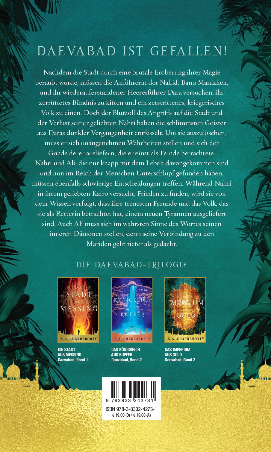 DAEVABAD IST GEFALLEN! Nachdem die Stadt durch eine brutale Eroberung ihrer Magie beraubt wurde, müssen die Anführerin der Nahid, Banu Manizheh, und ihr wiederauferstandener Heeresführer Dara versuchen, ihr zerrüttetes Bündnis zu kitten und ein zerstrittenes, kriegerisches Volk zu einen. Doch der Blutzoll des Angriffs auf die Stadt und der Verlust seiner geliebten Nahri haben die schlimmsten Geister aus Daras dunkler Vergangenheit entfesselt. Um sie auszulöschen, muss er sich unangenehmen Wahrheiten stellen und sich der Gnade derer ausliefern, die er einst als Feinde betrachtete. Nahri und Ali, die nur knapp mit dem Leben davongekommen sind und nun im Reich der Menschen Unterschlupf gefunden haben, müssen ebenfalls schwierige Entscheidungen treffen. Während Nahri in ihrem geliebten Kairo versucht, Frieden zu finden, wird sie von dem Wissen verfolgt, dass ihre treuesten Freunde und das Volk, das sie als Retterin betrachtet hat, einem neuen Tyrannen ausgeliefert sind. Auch Ali muss sich im wahrsten Sinne des Wortes seinen inneren Dämonen stellen, denn seine Verbindung zu den Mariden geht tiefer als gedacht.Band 3 der Daevabad-TrilogieDie Daevabad-Trilogie im ÜberblickBand 1: Die Stadt aus MessingBand 2: Das Königreich aus KupferBand 3: Das Imperium aus GoldErweiterung der Trilogie: Der Fluss aus Silber