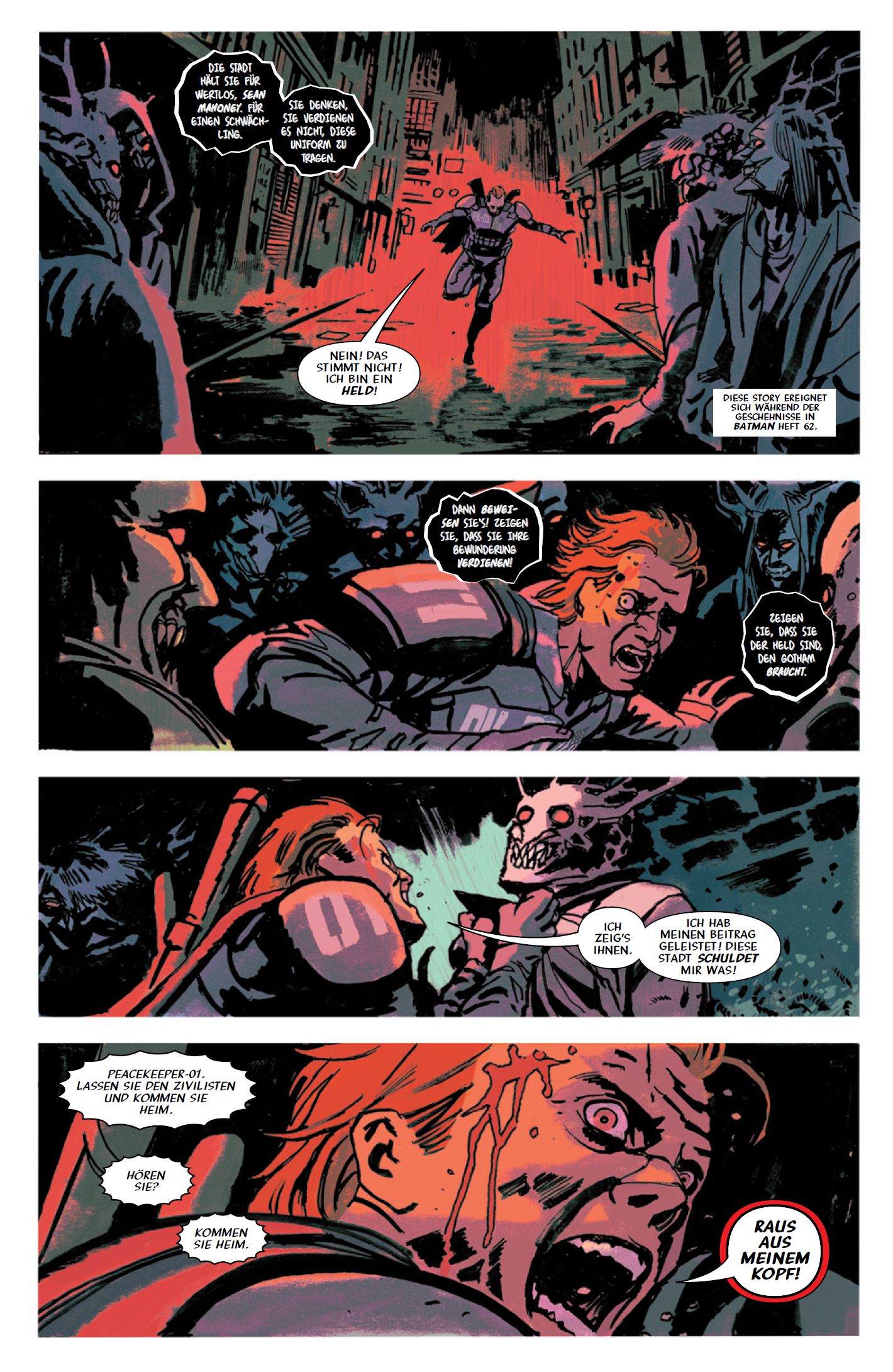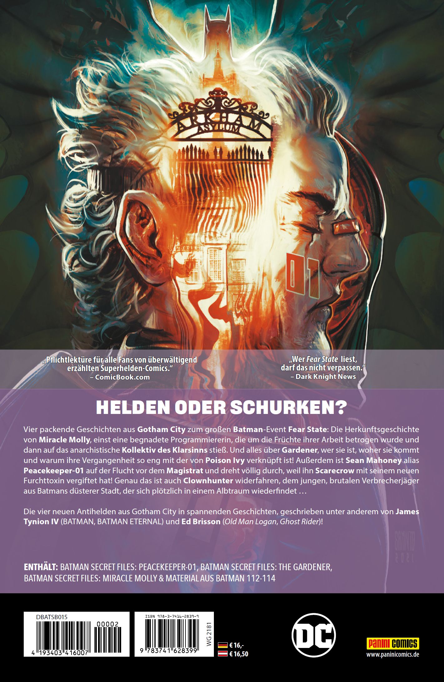 STADT DER ANGST von Christian Endres Der Joker-Krieg stürzte Gotham City ins Chaos. Allerdings standen dem Dunklen Ritter sogar Jokers inzwischen in Poison Ivy verliebte Ex Harley Quinn sowie der junge Bao Pham alias Clownhunter bei und halfen Batman, seine Stadt zurückzuerobern. Doch jetzt ist Gotham der Furcht anheimgefallen! Die Schuld daran trägt der Industrielle Simon Saint: Er will, dass seine Magistrat genannte, von Peacekeeper-01 angeführte Hightech-Privatarmee in Gotham für Recht und Ordnung sorgt. Zum Erreichen seiner Ziele paktierte Saint mit dem Superschurken Scarecrow, dem Meister der Furcht. Doch Scarecrow verriet Saint und verwandelte Gotham in einen Ort, wo Angst und Wahnsinn regieren. So weit die Vorgeschichte zum Event Fear State - Stadt der Angst, das aktuell in BATMAN, BATMAN - DETECTIVE COMICS und anderen Serien über die Welt des Dunklen Ritters tobt. In diesem Sonderband sehen wir, wie es mit dem ehemaligen Arkham Asylum-Wärter Sean Mahoney als Peacekeeper-01 weitergeht, der von Scarecrow eine hohe Dosis Angst-Gas verpasst bekam und mit Wahnvorstellungen durch die Straßen irrt. Zudem werden die Herkunftsgeschichten von ihm, Poison Ivys Ex Gardener sowie Miracle Molly gelüftet, die mit dem Kollektiv des Klarsinns gegen die manipulative Obrigkeit Gothams rebelliert ...