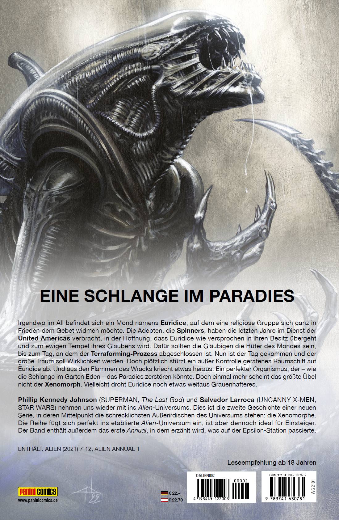 EINE SCHLANGE IM PARADIES Irgendwo im All befindet sich ein Mond namens Euridice, auf dem eine religiöse Gruppe sich ganz in Frieden dem Gebet widmen möchte. Die Adepten, die Spinners, haben die letzten Jahre im Dienst der United Americas verbracht, in der Hoffnung, dass Euridice wie versprochen in ihren Besitz übergeht und zum ewigen Tempel ihres Glaubens wird. Dafür sollten die Gläubigen die Hüter des Mondes sein, bis zum Tag, an dem der Terraforming-Prozess abgeschlossen ist. Nun ist der Tag gekommen und der große Traum soll Wirklichkeit werden. Doch plötzlich stürzt ein außer Kontrolle geratenes Raumschiff auf Euridice ab. Und aus den Flammen des Wracks kriecht etwas heraus. Ein perfekter Organismus, der - wie die Schlange im Garten Eden - das Paradies zerstören könnte. Doch einmal mehr scheint das größte Übel nicht der Xenomorph. Vielleicht droht Euridice noch etwas weitaus Grauenhafteres. Phillip Kennedy Johnson (SUPERMAN, The Last God) und Salvador Larroca (UNCANNY X-MEN, STAR WARS) nehmen uns wieder mit ins Alien-Universums. Dies ist die zweite Geschichte einer neuen Serie, in deren Mittelpunkt die schrecklichsten Außerirdischen des Universums stehen: die Xenomorphe. Die Reihe fügt sich perfekt ins etablierte Alien-Universum ein, ist aber dennoch ideal für Einsteiger. Der Band enthält außerdem das erste Annual, in dem erzählt wird, was auf der Epsilon-Station passierte. ENTHÄLT: ALIEN (2021) 7-12, ALIEN ANNUAL 1Leseempfehlung ab 18 Jahren