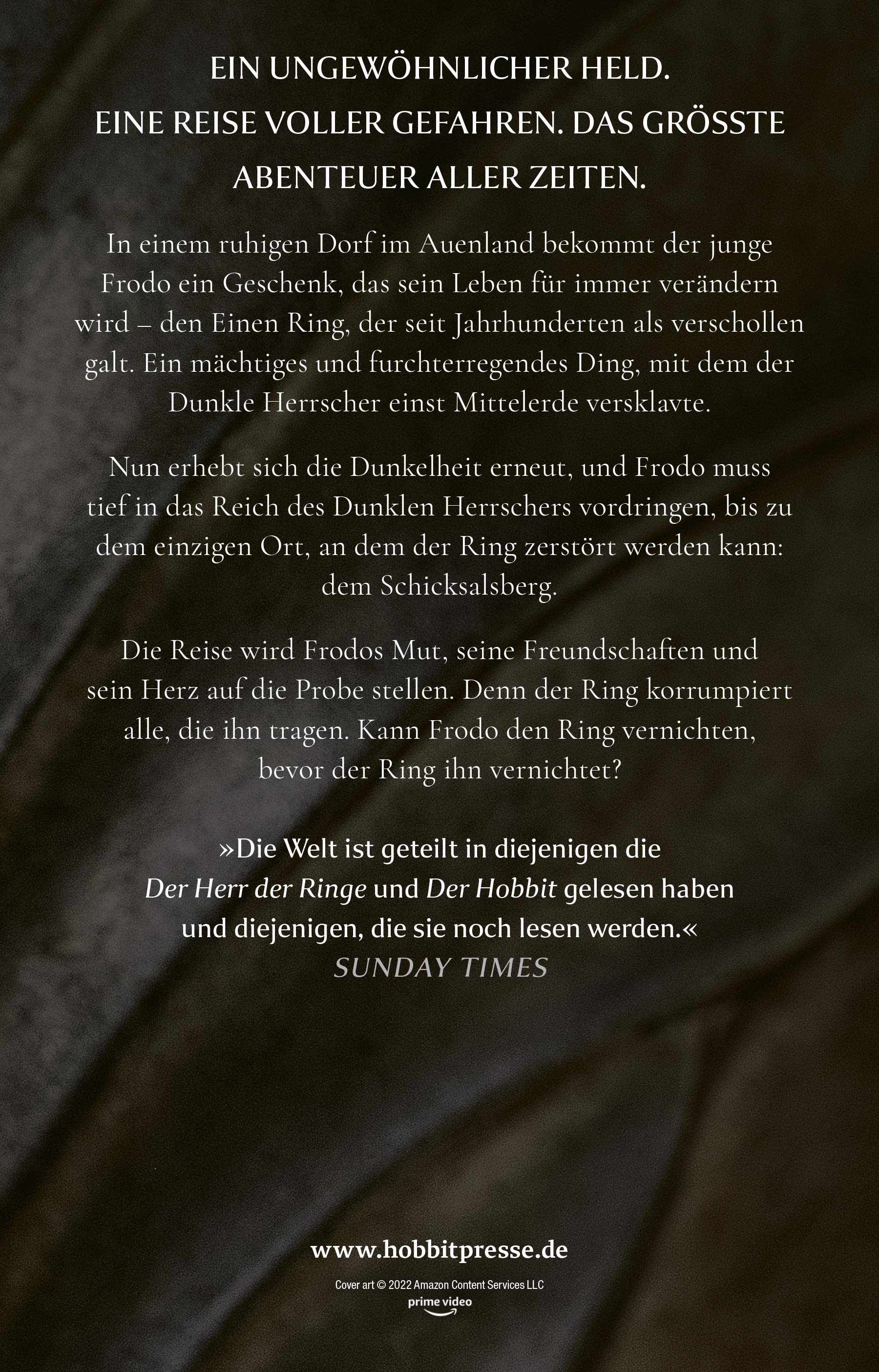 Der Eine Ring wurde Sauron im Lauf der Zeit genommen und so sehr er ihn auch in ganz Mittelerde suchte, er blieb dennoch für ihn verloren. Zeitalter später fällt der Ring in die Hände des Hobbits Bilbo Beutlin, der ihn an seinen Neffen Frodo weitergibt ... und so beginnt das größte und gefährlichste Abenteuer der Fantasyliteratur.