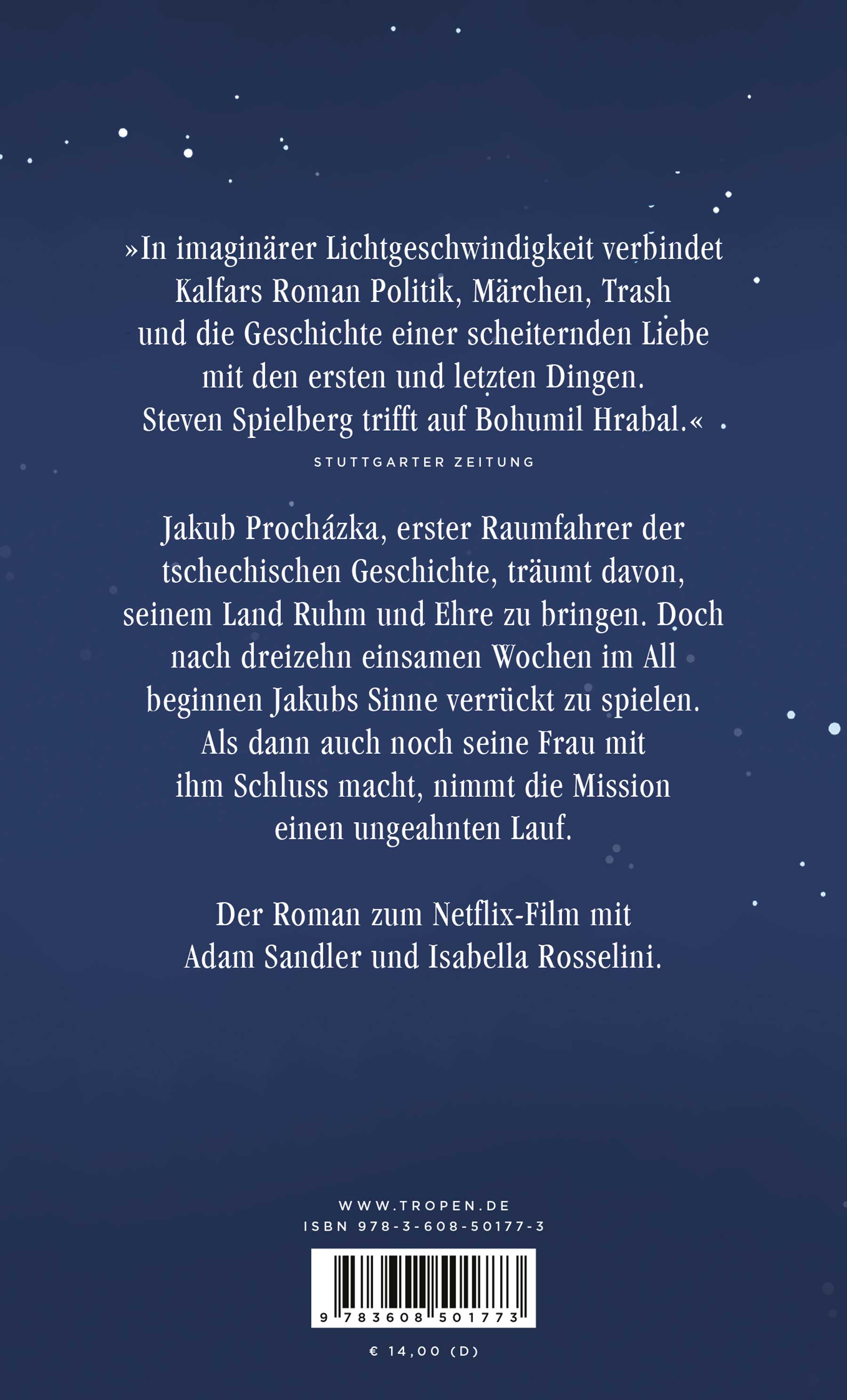 »Man muss Jaroslav Kalfars böhmische Raumfahrtsgeschichte nicht an Kafka, Lem, Hasek oder Philipp K. Dick messen. Der junge tschechische Autor mit amerikanischem Pass und einem auf den rechten Unterarm tätowierten Astronauten bringt in seinem Romandebüt Realität und Fantasie auf eine durchaus eigene Formel.«