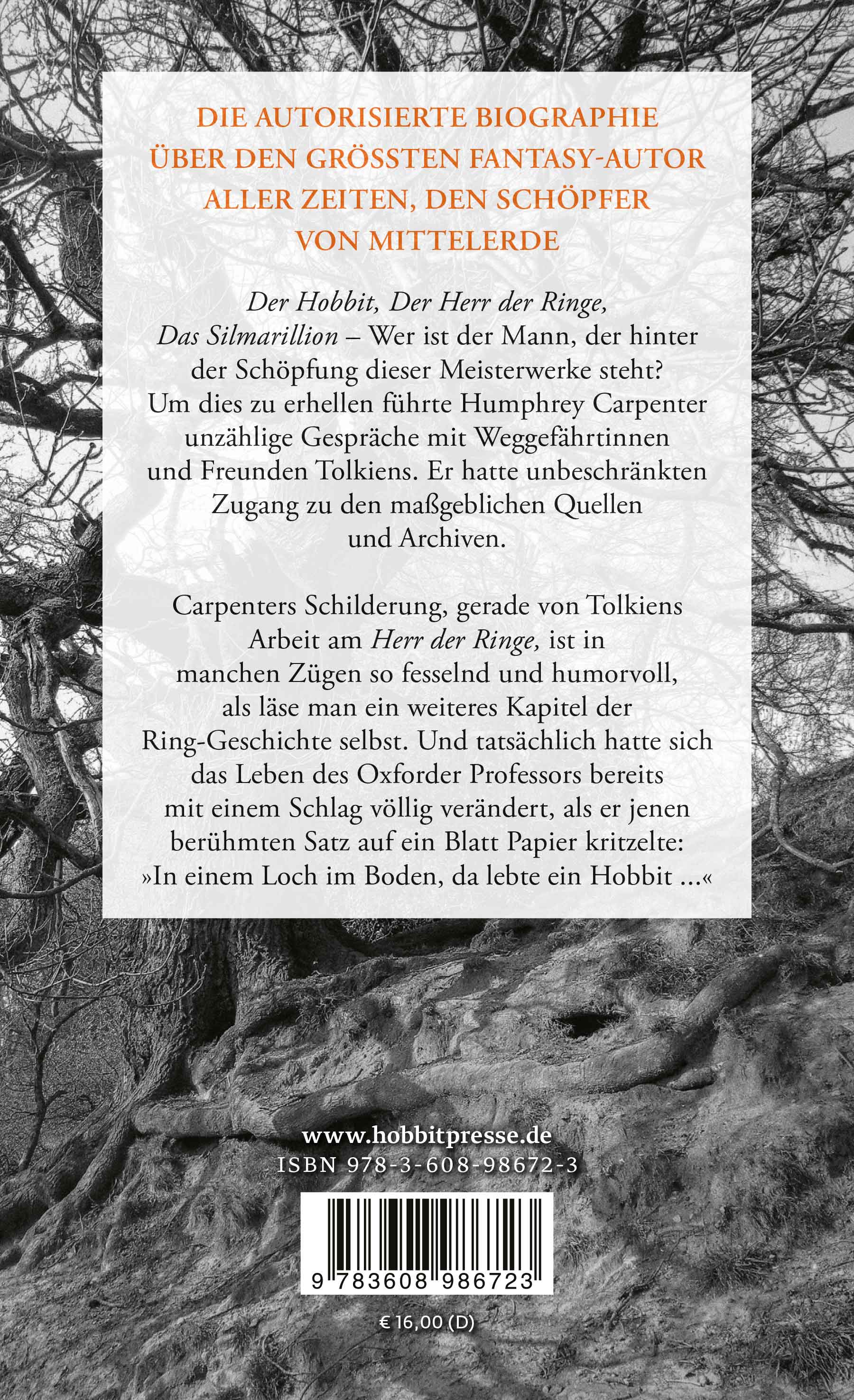 Wer ist der Mann, der hinter der Schöpfung des »Hobbit«, des »Herr der Ringe« und des »Silmarillion« steht? Um dies zu erhellen führte Humphrey Carpenter unzählige Gespräche mit Weggefährtinnen und Freunden Tolkiens. Er hatte unbeschränkten Zugang zu den maßgeblichen Quellen und Archiven. Der deutsche Tolkienverlag legt diese Biographie, die zum Kanon der Tolkienliteratur gehört, nun in einer neuen broschierten Ausgabe vor.