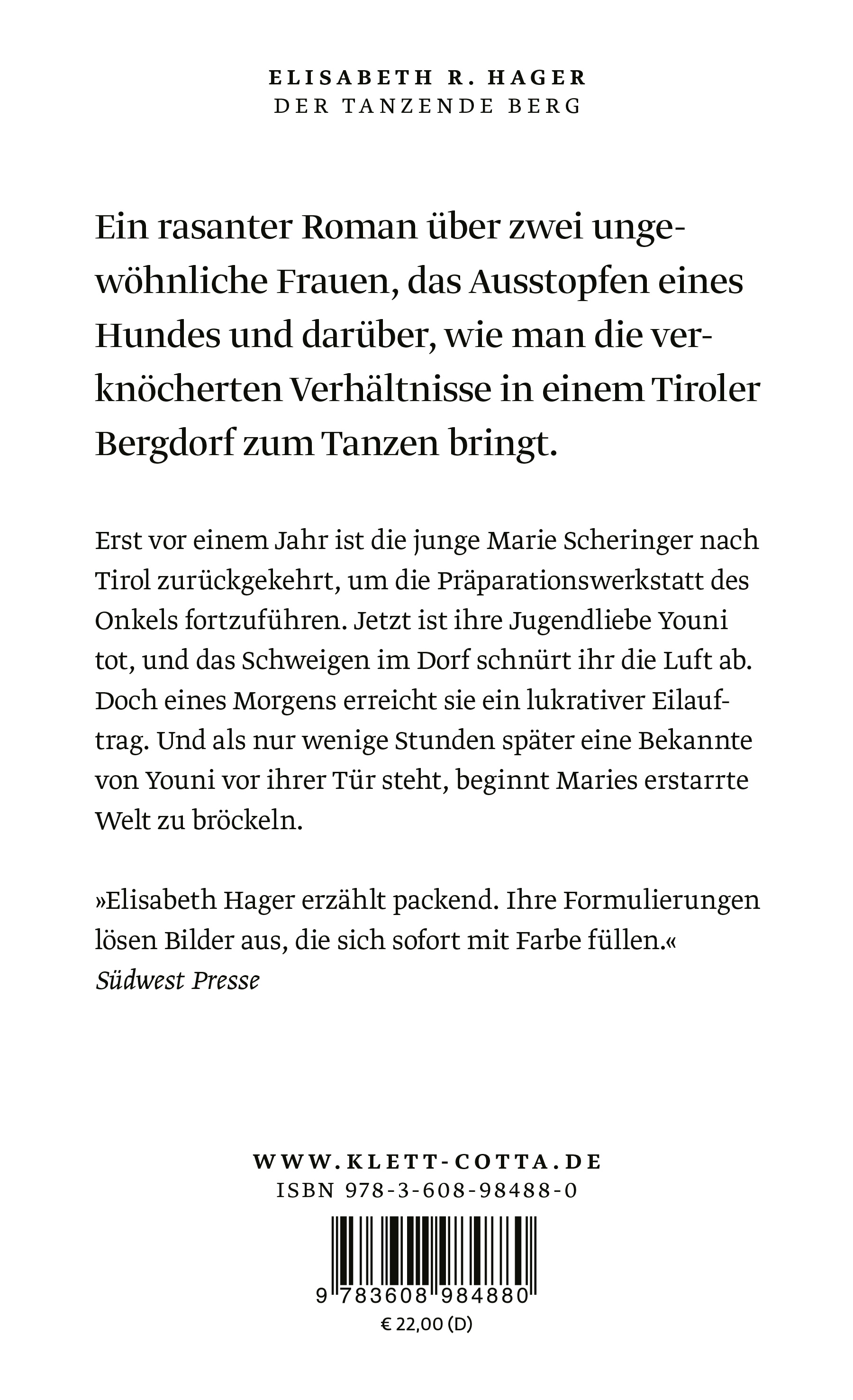 »In einer geschmeidigen, zwischen Leichtigkeit und Tiefe changierenden Prosa erzählt Hager von zwei Frauen, die sich nicht anpassen wollen, von einem Toten, der präsenter ist als so mancher Lebende, und von einem Dorf, das sich in der Erstarrung eingerichtet hat. […] Es geht um Individualität und Einzigartigkeit, um das Ineinanderfließen von Natur und Kultur, um Leben, Tod und den (oft widersinnigen) Versuch, Vergangenes zu konservieren.«