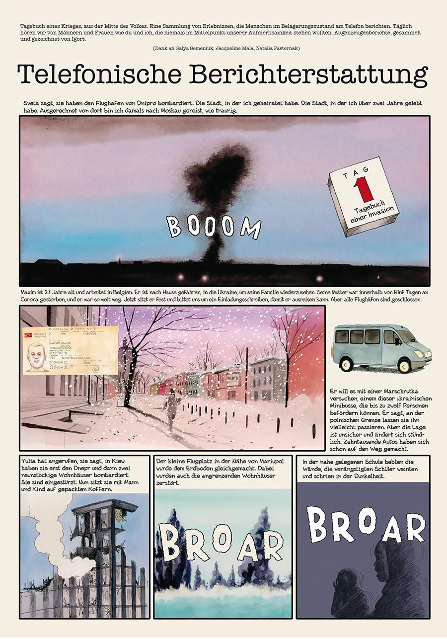 Igort lebte über zwei Jahre lang in der Ukraine. Nachdem er die Wurzeln dieses Konflikts in seinen ersten BERICHTEN AUS DER UKRAINE beschrieben hatte, kehrte er zurück, um denjenigen eine Stimme zu geben, die normalerweise ungehört bleiben: den einfachen Menschen, die unter diesem sinnlosen und brutalen Krieg leiden.