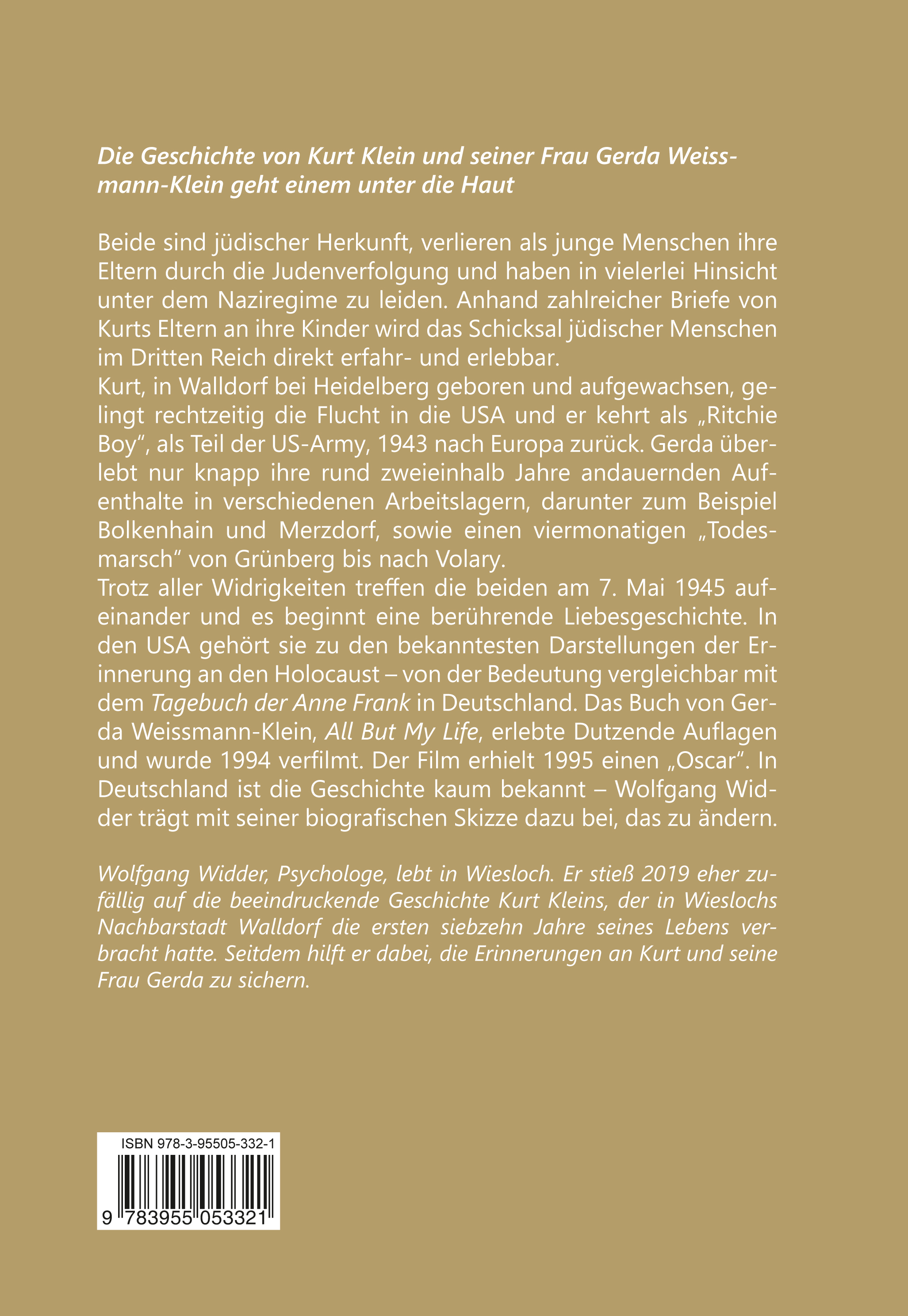 Die Geschichte von Kurt Klein und seiner Frau Gerda Weissmann-Klein geht einem unter die HautBeide sind jüdischer Herkunft, verlieren als junge Menschen ihre Eltern durch die Judenverfolgung und haben in vielerlei Hinsicht unter dem Naziregime zu leiden. Anhand zahlreicher Briefe von Kurts Eltern an ihre Kinder wird das Schicksal jüdischer Menschen im Dritten Reich direkt erfahr- und erlebbar.Kurt, in Walldorf bei Heidelberg geboren und aufgewachsen, gelingt rechtzeitig die Flucht in die USA und er kehrt als "Ritchie Boy", als Teil der US-Army, 1943 nach Europa zurück. Gerda überlebt nur knapp ihre rund zweieinhalb Jahre andauernden Aufenthalte in verschiedenen Arbeitslagern, darunter zum Beispiel Bolkenhain und Merzdorf, sowie einen viermonatigen Todesmarsch" von Grünberg bis nach Volary. Trotz aller Widrigkeiten treffen die beiden am 7. Mai 1945 aufeinander und es beginnt eine berührende Liebesgeschichte. In den USA gehört sie zu den bekanntesten Darstellungen der Erinnerung an den Holocaust - von der Bedeutung vergleichbar mit dem Tagebuch der Anne Frank in Deutschland. Das Buch von Gerda Weissmann-Klein, All But My Life, erlebte Dutzende Auflagen und wurde 1994 verfilmt. Der Film erhielt 1995 einen "Oscar". In Deutschland ist die Geschichte kaum bekannt - Wolfgang Widder trägt mit seiner biografischen Skizze dazu bei, das zu ändern.