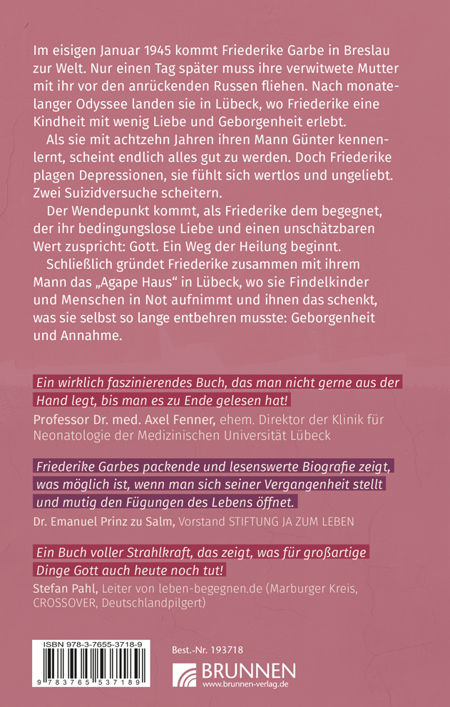 Die packende Biografie einer starken Frau der "Generation Kriegskind", die Depression und Selbstablehnung überwindet, ihren wahren Wert entdeckt und heute ein gefragtes Senior-Model ist.Im eisigen Januar 1945 kommt Friederike Garbe in Breslau zur Welt. Nur einen Tag später muss ihre verwitwete Mutter mit Friederike vor den anrückenden Sowjets fliehen. Nach monatelanger Odyssee landen sie in Lübeck, wo Friederike eine harte Kindheit ohne Liebe und Geborgenheit erlebt.Als sie mit achtzehn ihren Mann Günter kennenlernt, scheint endlich alles gut zu werden. Doch Friederike plagen Depressionen, sie fühlt sich wertlos und ungeliebt. Ihre Ängste ertränkt sie in Alkohol. Zwei Suizidversuche scheitern.Der Wendepunkt kommt, als Friederike dem begegnet, der ihr bedingungslose Liebe und einen unveräußerlichen Wert zuspricht: Jesus Christus. Ein Weg der Heilung beginnt, auf dem Friederike sogar anderen helfen kann. Schließlich erfüllt sie sich einen Kindheitstraum und gründet das "Agape Haus" in Lübeck, wo Findelkinder und Menschen in Not ein neues Zuhause finden.2012 erlangt Friederike Garbe durch einen Auftritt bei "Wer wird Millionär?" größere Bekanntheit. Seit sie mit sechzig entdeckt wurde, arbeitet sie als erfolgreiches Senior-Model.