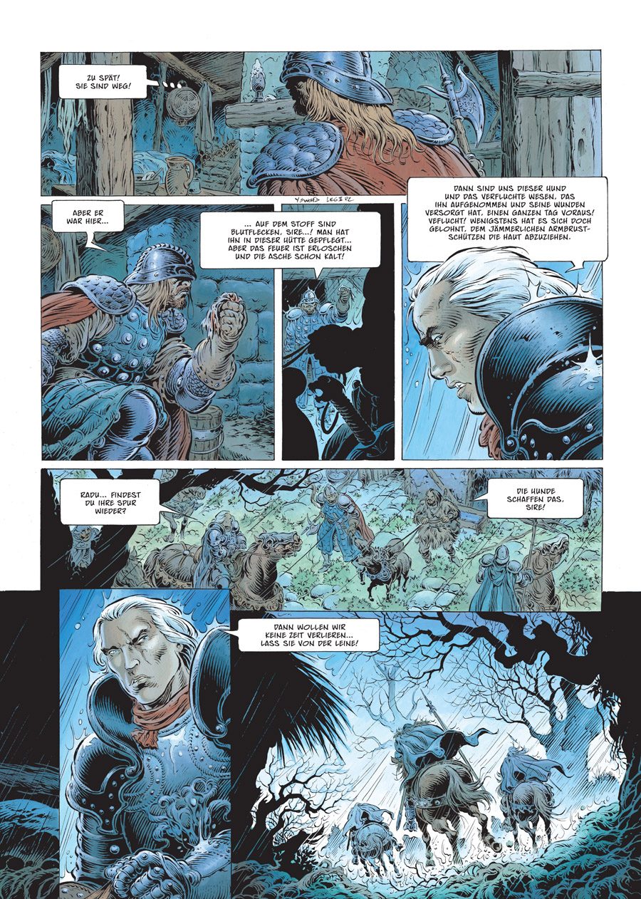 Im tiefen Wald, nahe des Anwesens seines Vaters, trifft Tristan auf Judith, seine Freundin aus Kindestagen. Judith erinnert sich genau an die schmerzhaften Lehrjahre, die Tristan durchlaufen musste, an seine Weigerung, einen unbewaffneten Soldaten zu töten und sich die Grausamkeit zu eigen zu machen, die sein Umfeld von ihm erwartete. Sie erinnert sich auch an die Verbundenheit, die einst zwischen ihnen bestand, und an die Machenschaften von Milo Shaggan, die alles veränderten...Hört die Legende des Fahrenden Ritters! Mit seiner ersten Reihe im Fantasy-Genre eroberte der seinerseits legendäre Comic-Künstler Yves Swolfs (»Durango«, »Der Prinz der Nacht«, »Lonesome«) aus dem Stand die Bestsellerlisten. Weniger High Fantasy à la Tolkien als vielmehr düstere Phantastik im Stile Sapkowskis ist »Legende« ein zeitloses Werk über den Kampf zwischen Gut, Böse und der bestialischen Natur des Menschen, das von Swolfs erzählerisch wie zeichnerisch brillant umgesetzt wird.Splitter veröffentlicht die überarbeitete Neuauflage der Bände 1-6 parallel zur Erstveröffentlichung der Folgebände ab Band 7.