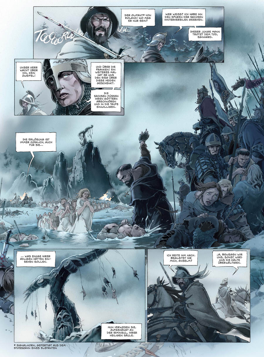 Im Jahre 778 strebt Karl der Große, Eroberer der germanischen Reiche, von Ehrgeiz und Stolz beflügelt danach, sich zum wahren »Verteidiger der Kirche« aufzuschwingen. Dafür will er südlich der Pyrenäen im Kampf gegen das Islamische Reich eine neue Frontlinie ziehen. Der Frankenkönig lässt sein mächtiges Heer gen Saragossa marschieren, um die große Stadt in Nordspanien zu unterwerfen. Als er dort von den Sarazenen verraten wird, verleitet Karls Wut ihn dazu, einen schwerwiegenden Fehler zu begehen...»Die Chroniken von Roncesvalles« übertragen das Epos Karls des Großen und seines legendären Heerführers Roland in die Neunte Kunst. In atmosphärischen, sublim kolorierten Bildern erzählt Juan Luis Landa die Geschichte eines blinden Eroberungskrieges mit katastrophalen Folgen, der seinen Höhepunkt in der dramatischen Schlacht von Roncesvalles findet. Dort liegt der Ursprung des »Rolandslieds«, eines zentralen Werks der französischen Literatur.