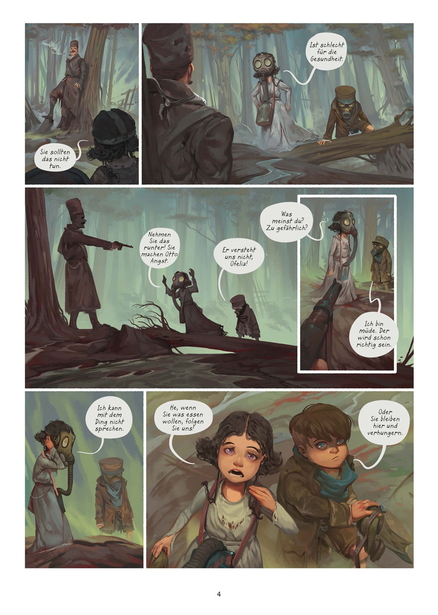 1916, irgendwo an der Ostfront zwischen Polen und Russland. Hinter den Toren eines Waisenhauses verbirgt sich unfassbares Grauen: Zwischen den Trümmerteilen des zerstörten Gebäudes und den verrottenden Leichen seiner ehemaligen Bewohner haben drei Kinder überlebt. Inmitten des unmenschlichen Krieges mussten sie dafür zu Monstern werden, denn sie ernähren sich von verlorenen Soldaten, die sie in ihr Domizil locken, umbringen und verspeisen. Eine der Waisen erträgt diese Art zu leben jedoch nicht länger und findet neue Freunde in den wunderschönen Porzellanpuppen, die in einem der vielen Räume des Waisenhauses auf hohen Regalen sitzen. Ihre ewig starr lächelnden Münder versprechen ihm Hilfe, wenn er ihnen ihren sehnlichsten Wunsch erfüllt...Ein intensiver Horrorcomic, dessen unheimliche Atmosphäre durch den kindlich-unschuldig wirkenden Zeichenstil des Argentiniers Juan Manuel Tumburu bis ins Unterträgliche gesteigert wird. Wirklich nichts für schwache Nerven!Empfohlen ab 18 Jahren.