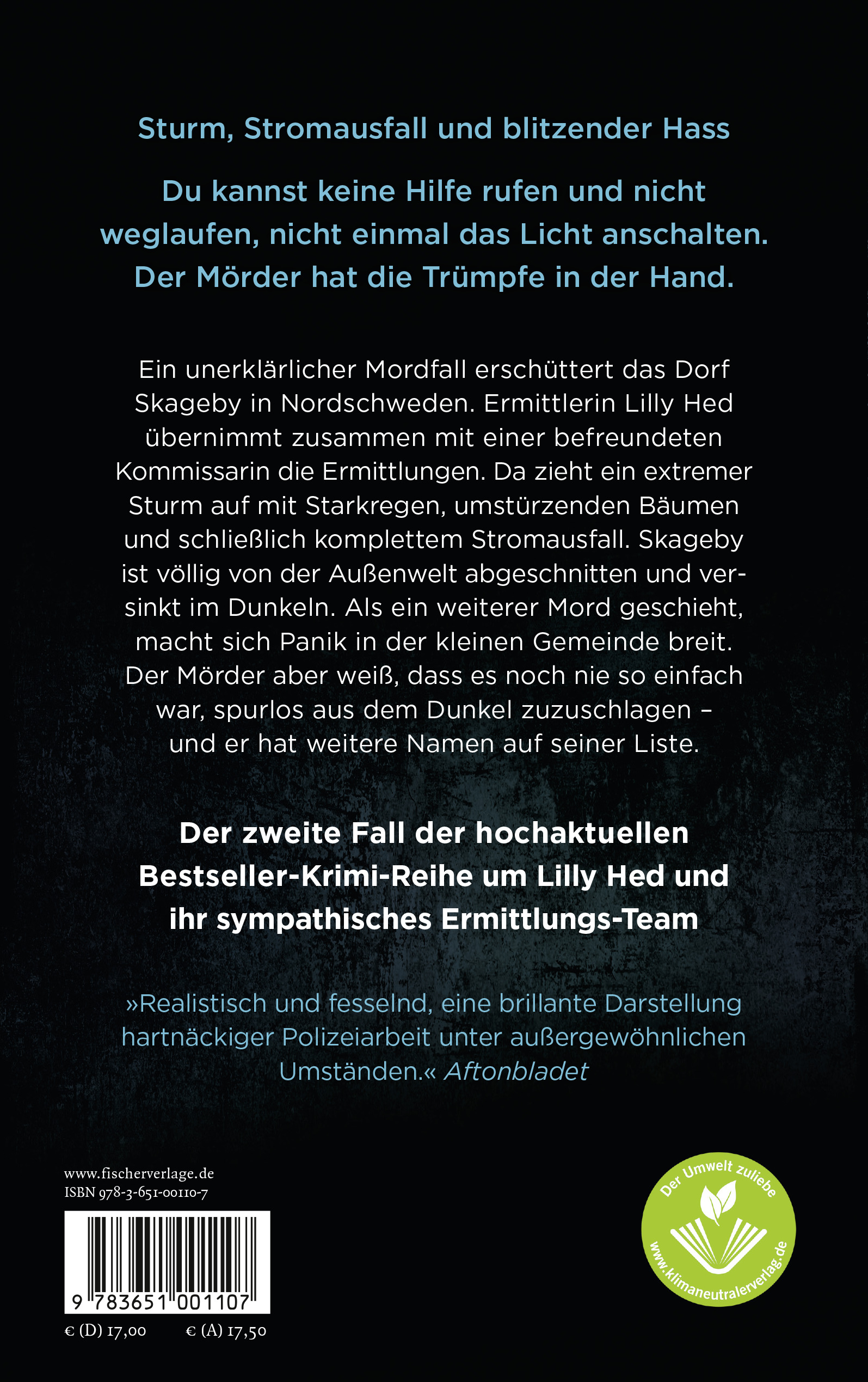 Ein unerklärlicher Mordfall erschüttert das Dorf Skageby in Nordschweden. Lilly Hed übernimmt zusammen mit einer befreundeten Kommissarin die Ermittlungen. Da zieht ein extremer Sturm auf mit Starkregen, umstürzenden Bäumen und schließlich komplettem Stromausfall. Skageby ist völlig von der Außenwelt abgeschnitten und versinkt im Dunkeln.