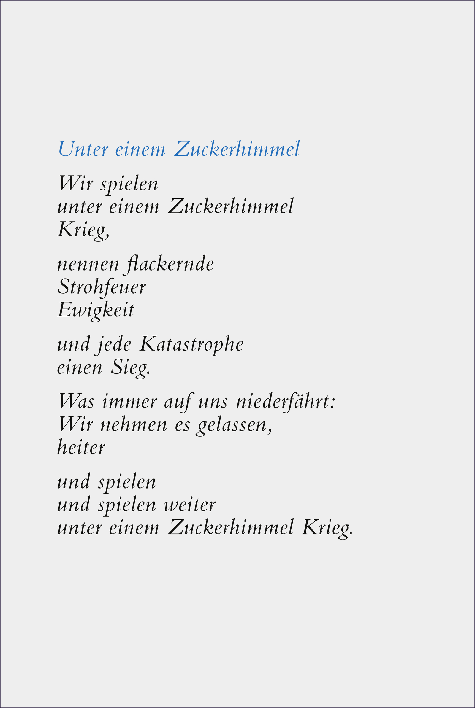 Anselm Kiefer hat Ransmayrs Balladen und Gedichte mit Serien von Aquarellen begleitet, die er ausschließlich für diesen Band geschaffen hat. Die vorliegende opulent ausgestattete Sammlung verschränkt die Sprache Christoph Ransmayrs mit der Kunst Anselm Kiefers. »Unter einem Zuckerhimmel« erscheint als der zwölfte Band, als Sonderband, in Christoph Ransmayrs Reihe »Spielformen des Erzählens«.