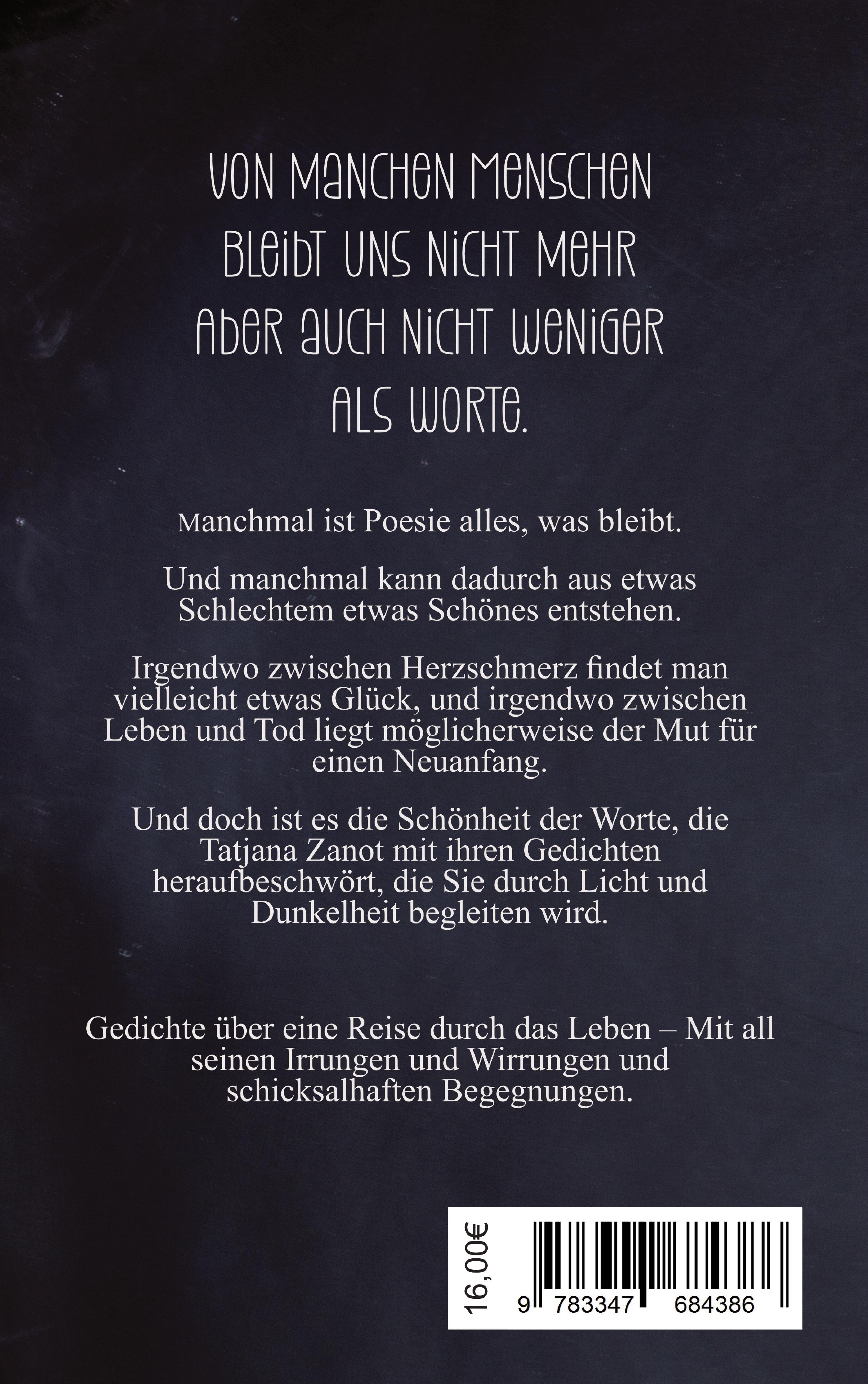 Gedichte gehen direkt ins Herz. Poesie ist das, was Menschen bewegt. Und genau das schaffen Dichter:Innen mit ihren Worten - Sie geben unbeschreiblichen Gefühlen einen Rahmen.Tatjana Zanot meistert es, mit ihren Gedichten Dinge zu beschreiben, für die andere keine Worte finden. Dabei spiegelt sich in ihren Gedichten auch manch eine Alltagssorge eines Millennials wider. Dennoch schafft sie es mit viel Feingefühl, zeitlos über das zu schreiben, was uns alle bewegt: Glück und Schmerz und alles dazwischen.Neugierig geworden?Hier ist der Klappentext:*Von manchen MenschenBleibt uns nicht mehrAber auch nicht wenigerAls Worte.*Manchmal ist Poesie alles, was bleibt.Und manchmal kann dadurch aus etwas Schlechtem etwas Schönes entstehen.Irgendwo zwischen Herzschmerz findet man vielleicht etwas Glück, und irgendwo zwischen Leben und Tod liegt möglicherweise der Mut für einen Neuanfang.Und doch ist es die Schönheit der Worte, die Tatjana Zanot mit ihren Gedichten heraufbeschwört, die Sie durch Licht und Dunkelheit begleiten wird.Gedichte über eine Reise durch das Leben - Mit all seinen Irrungen und Wirrungen und schicksalhaften Begegnungen.
