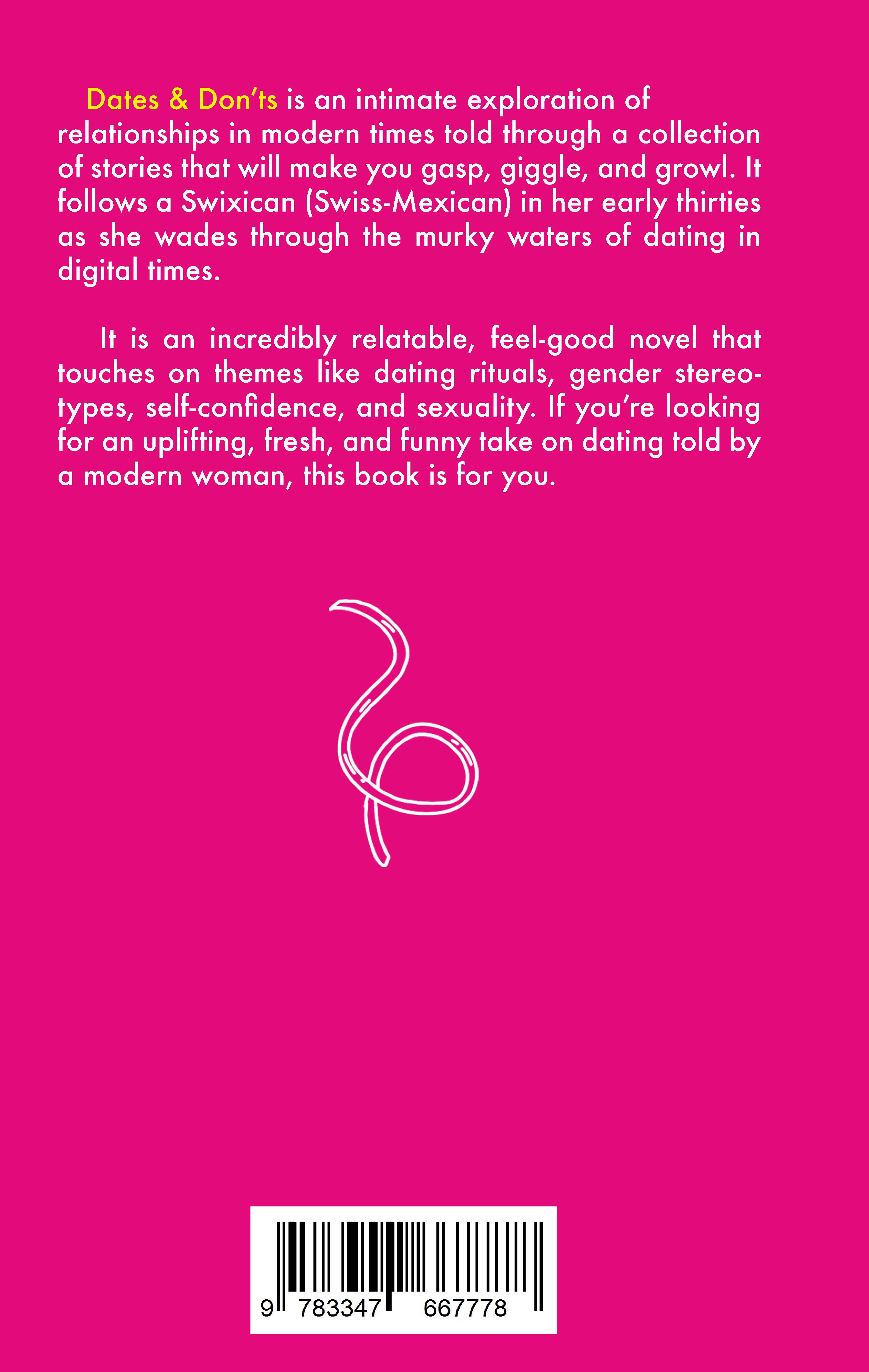 Dates & Don'ts is an intimate exploration of relationships in modern times told through a collection of stories that will make you gasp, giggle, and growl. It follows a Swixican (Swiss-Mexican) in her early thirties as she wades through the murky waters of dating in digital times. It is an incredibly relatable, feel-good novel that touches on themes like dating rituals, gender stereotypes, self-confidence, and sexuality. If you're looking for an uplifting, fresh, and funny take on dating told by a modern woman, this book is for you.
