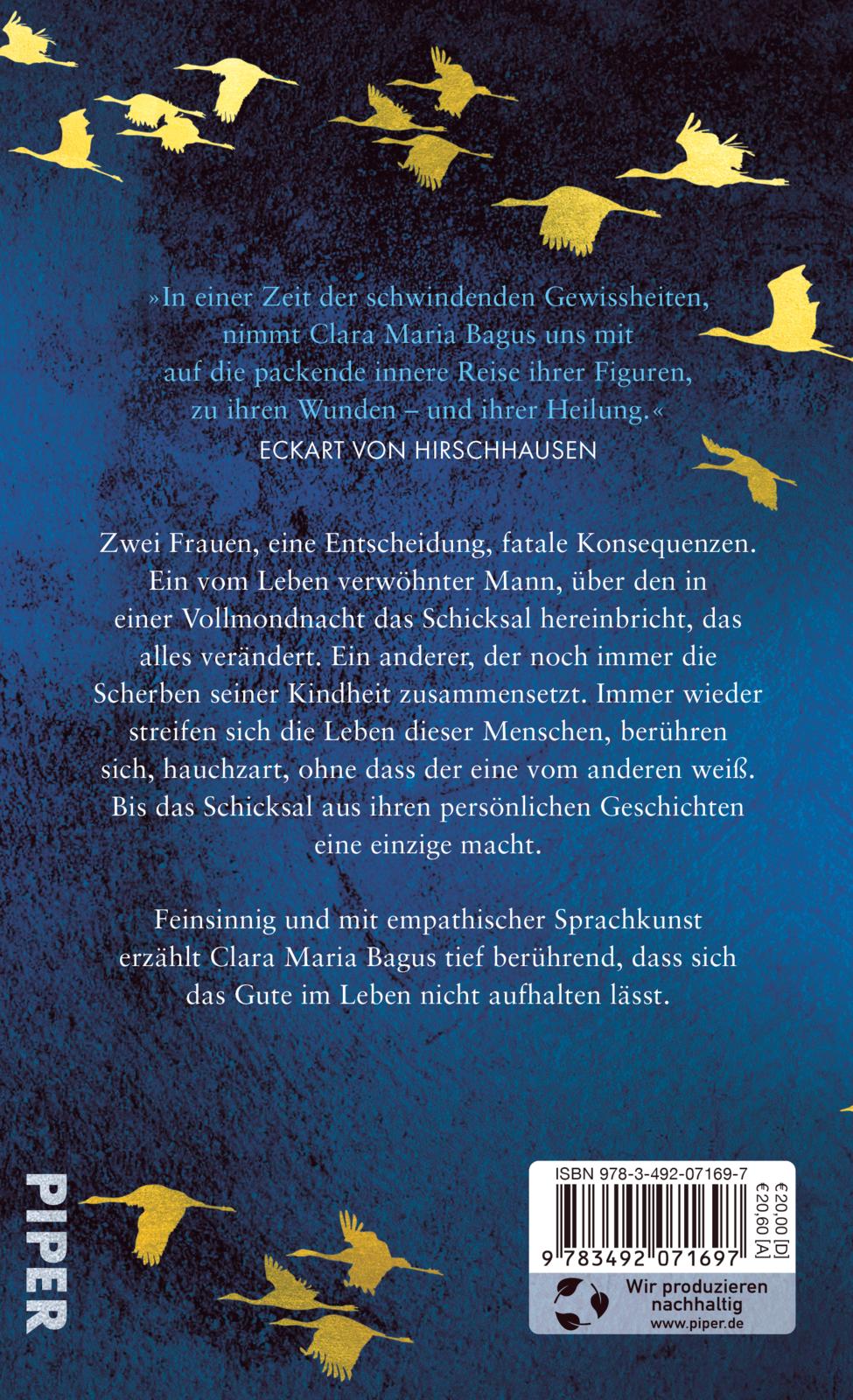 Kennen Sie dieses Gefühl? Manchmal möchte man einfach aus dem Leben verschwinden. Zwei Frauen, eine Entscheidung, fatale Konsequenzen. Ein vom Leben verwöhnter Mann, über den in einer Vollmondnacht das Schicksal hereinbricht, das alles verändert. Ein anderer, der noch immer die Scherben seiner Kindheit zusammensetzt. Immer wieder streifen sich die Leben dieser Menschen, berühren sich, hauchzart, ohne dass der eine vom anderen weiß. Bis das Schicksal aus ihren persönlichen Geschichten eine einzige macht. Ein Roman, der heilt und uns mit dem Leben versöhnt. Feinsinnig und mit empathischer Sprachkunst erzählt Clara Maria Bagus tief berührend, dass sich das Gute im Leben nicht aufhalten lässt.