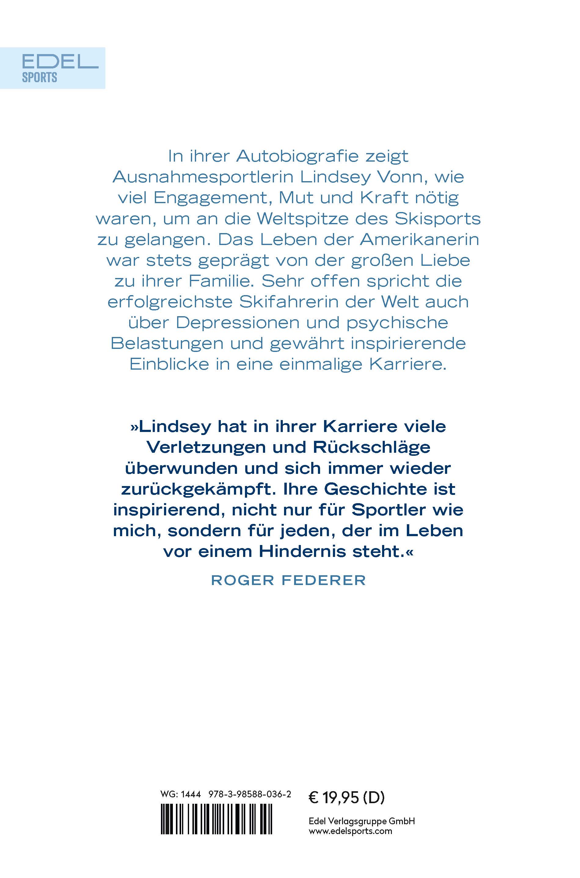 Lindsey Vonn, geboren 1984 in Minnesota/USA, gilt als erfolgreichste Skirennläuferin der Geschichte. Sie war Olympiasiegerin, Weltmeisterin und gewann 20 World-Cup-Titel. 2019 trat sie vom aktiven Skirennsport zurück und ist seitdem u. a. als Fernsehexpertin tätig. Die von ihr gegründete Lindsey Vonn Foundation setzt sich für die Talentförderung junger Mädchen ein. Aufgrund jahrelanger Aufenthalte in Österreich spricht sie fließend Deutsch.