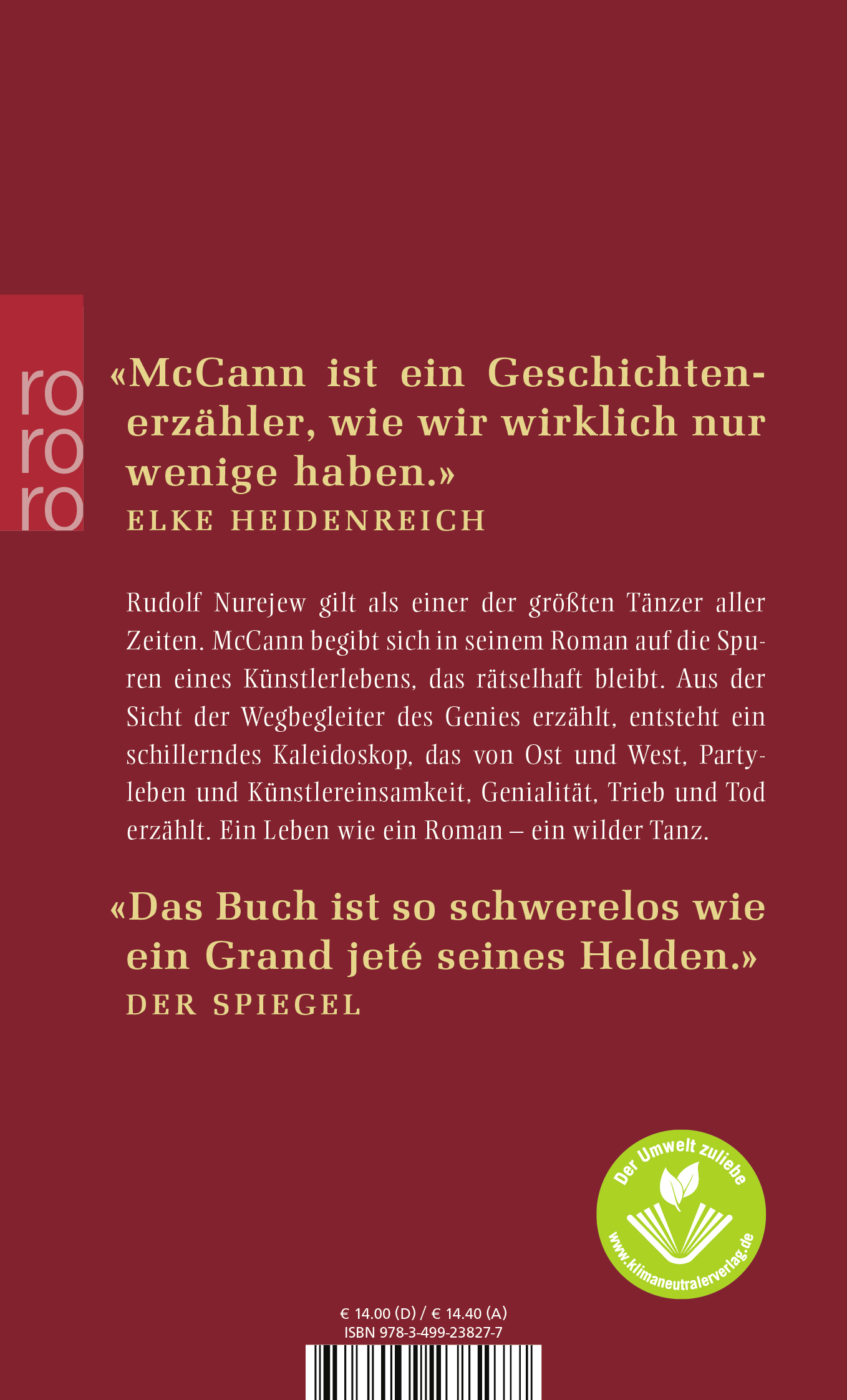 Rudolf Nurejew galt als einer der größten Tänzer aller Zeiten. McCann begibt sich in seinem Roman auf die Spuren eines Künstlerlebens, das rätselhaft bleibt. Aus der Sicht der Wegbegleiter des Genies erzählt, entsteht ein schillerndes Kaleidoskop, das von Ost und West, Partyleben und Künstlereinsamkeit, Genialität, Trieb und Tod erzählt. Ein Leben wie ein Roman - ein wilder Tanz.