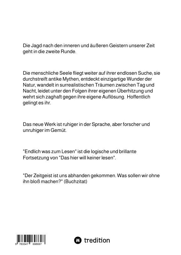 | Schlagworte | Kurzgeschichten • Lyrische Texte • menschlicher Größenwahn • Naturbeobachtung • Naturphänomene • Postmoderne • Psychische Erkrankungen • Sehnsucht nach Glück • Spiritualität • Zeitgeist |