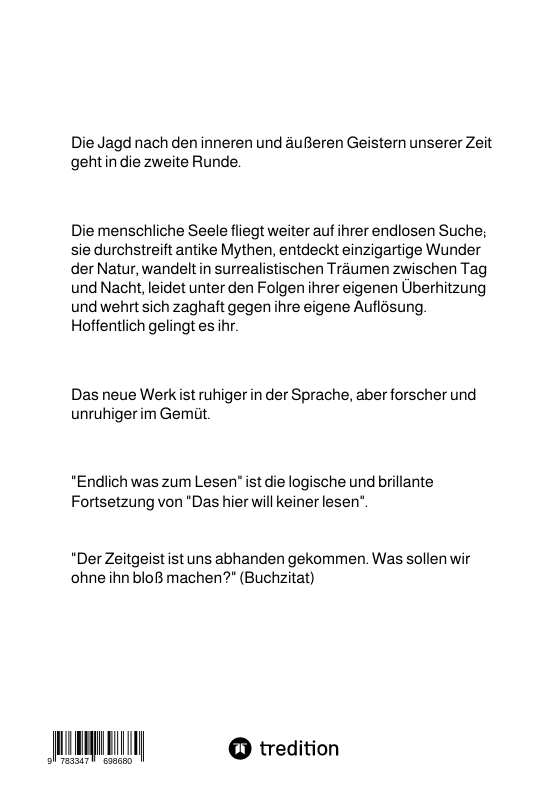 | Schlagworte | Kurzgeschichten • Lyrische Texte • menschlicher Größenwahn • Naturbeobachtung • Naturphänomene • Postmoderne • Psychische Erkrankungen • Sehnsucht nach Glück • Spiritualität • Zeitgeist |