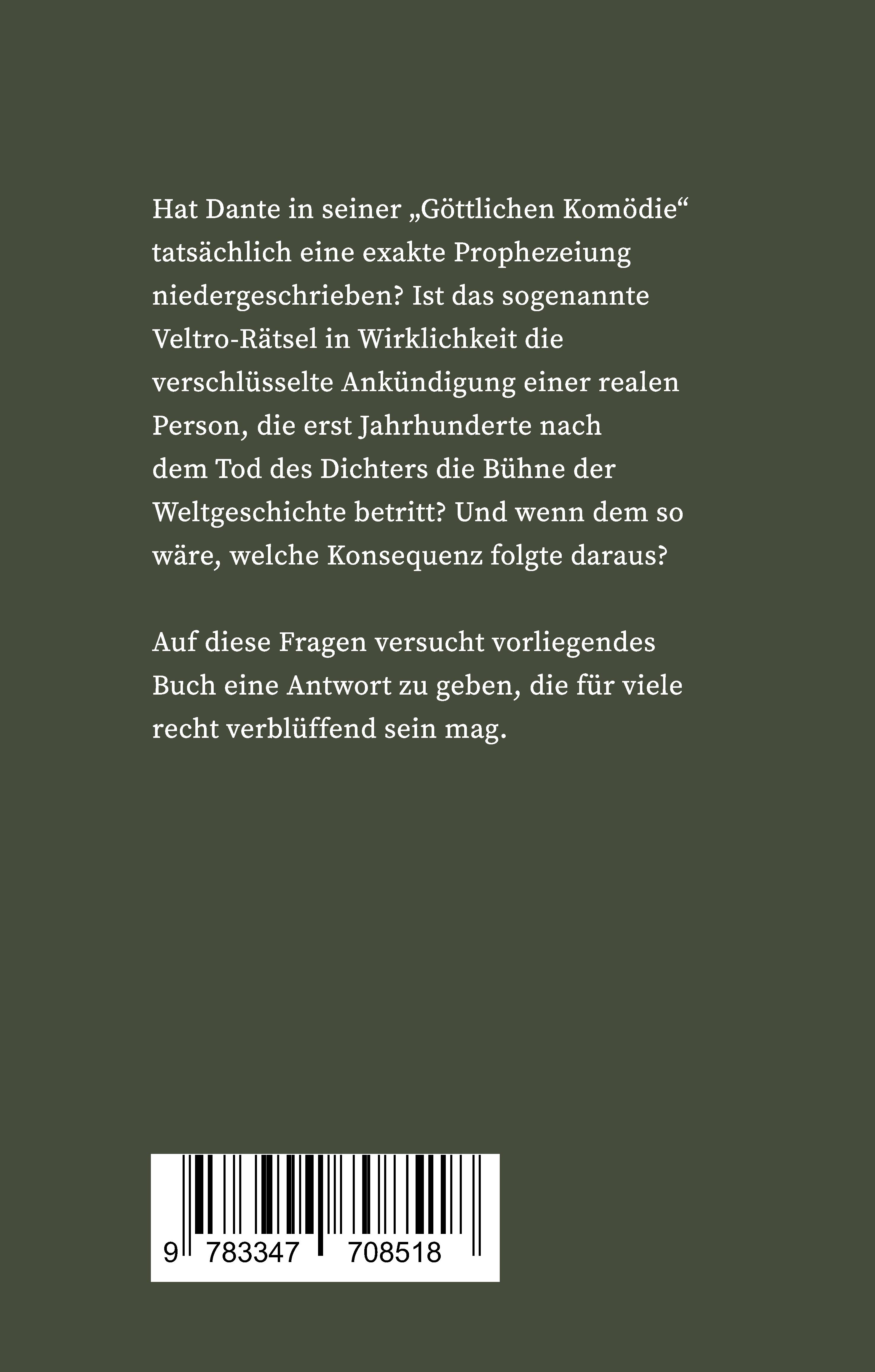 Hat Dante in seiner "Göttlichen Komödie" tatsächlich eine exakte Prophezeiung niedergeschrieben? Ist das sogenannte Veltro-Rätsel in Wirklichkeit die verschlüsselte Ankündigung einer realen Person, die erst Jahrhunderte nach dem Tod des Dichters die Bühne der Weltgeschichte betritt? Und wenn dem so wäre, welche Konsequenz folgte daraus? Auf diese Fragen versucht vorliegendes Buch eine Antwort zu geben, die für viele recht verblüffend sein mag.