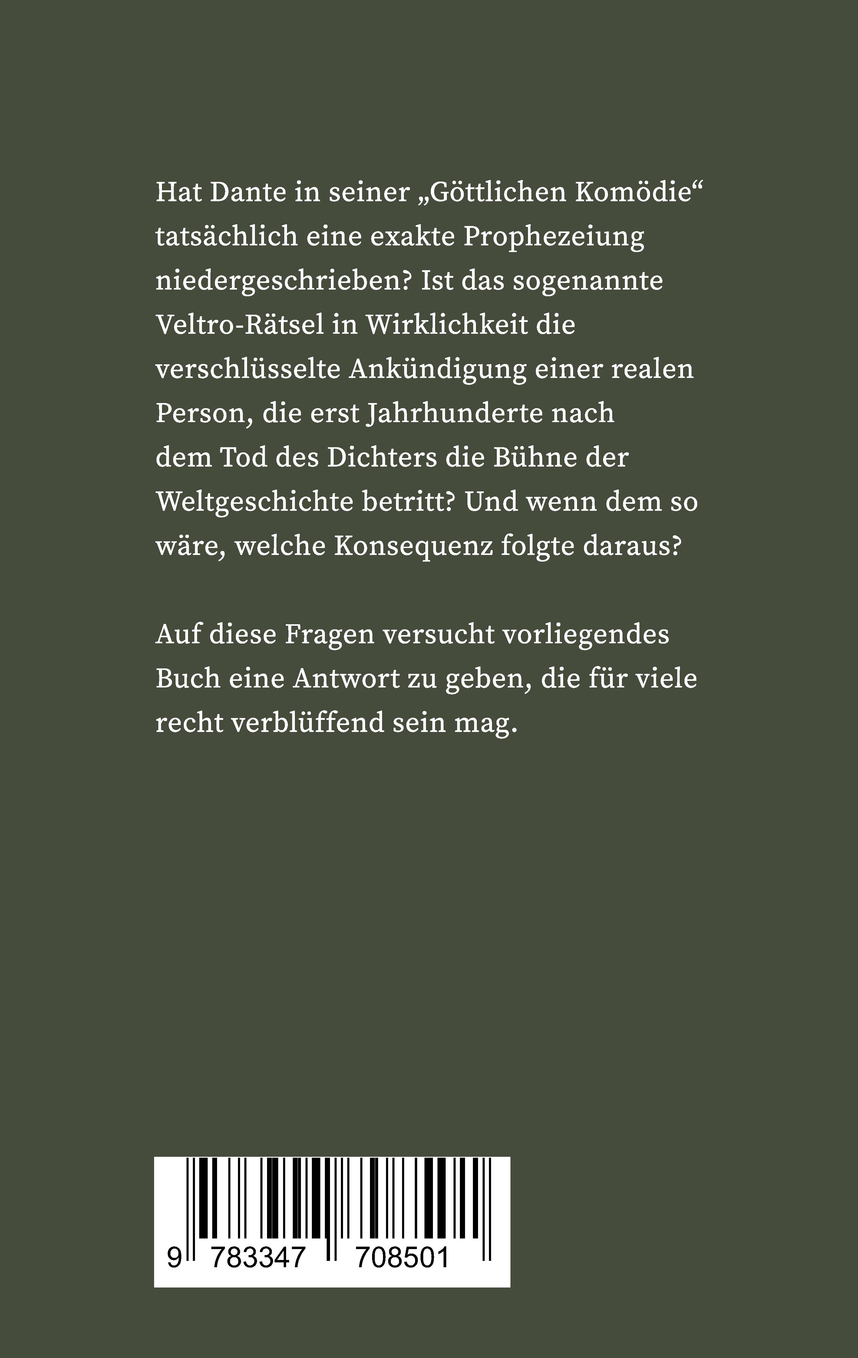 Hat Dante in seiner "Göttlichen Komödie" tatsächlich eine exakte Prophezeiung niedergeschrieben? Ist das sogenannte Veltro-Rätsel in Wirklichkeit die verschlüsselte Ankündigung einer realen Person, die erst Jahrhunderte nach dem Tod des Dichters die Bühne der Weltgeschichte betritt? Und wenn dem so wäre, welche Konsequenz folgte daraus? Auf diese Fragen versucht vorliegendes Buch eine Antwort zu geben, die für viele recht verblüffend sein mag.